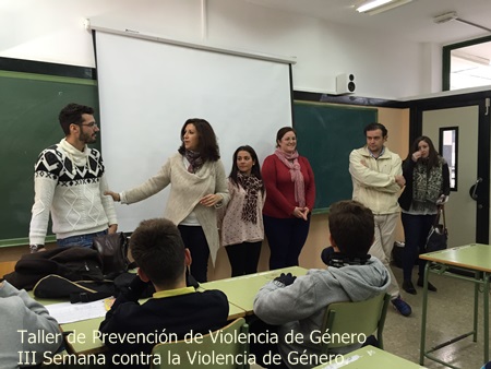 Ayer tuvo lugar el Taller de prevención de violencia de género y acciones de reconocimiento de malos tratos dirigida al alumnado de 3º de E.S.O del IES Tierra de Lagunas, centrado como indica su título en identificar este tipo de violencia y sus tipos así como reconocer los indicios para identificarlas . Mª José Castillo Cruz, concejala delegada del Área de Políticas Sociales, ha sido la persona encargada en abrir la charla y presentar a José Antonio Cabo, psicólogo y a l@s técnic@s del PIM. Esta actividad se encuentra dentro de la programación de la III Semana contra la Violencia de Género, organizada por el PIM y en esta ocasión en colaboración con el Área de Cohesión Social e Igualdad de Diputación de Sevilla y el IES Tierra del Lagunas.