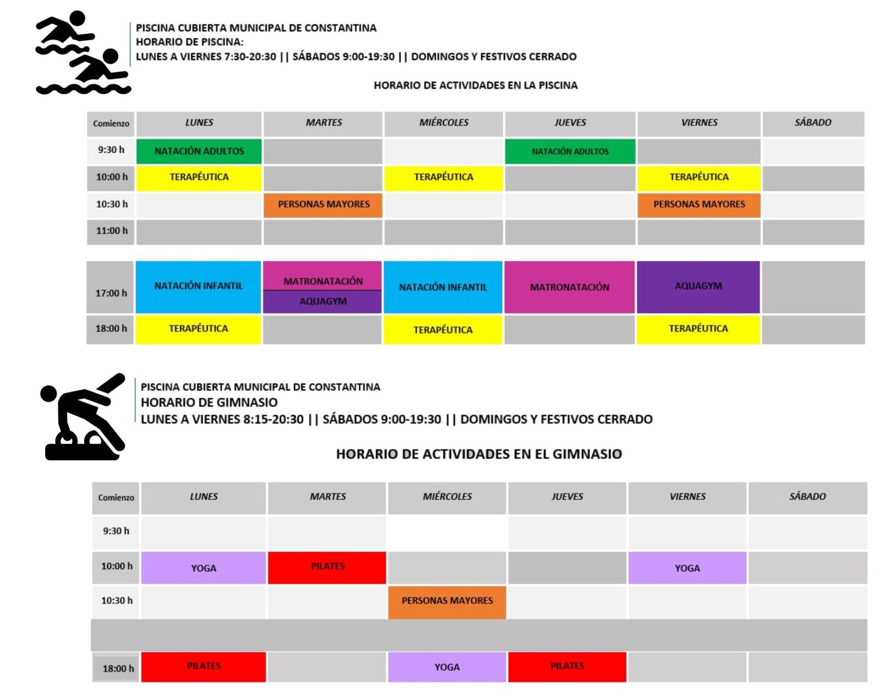 Os traemos el horario de actividades actualizados al mes de ENERO de 2021 de la Piscina Cubierta Municipal de Constantina y su gimnasio.
