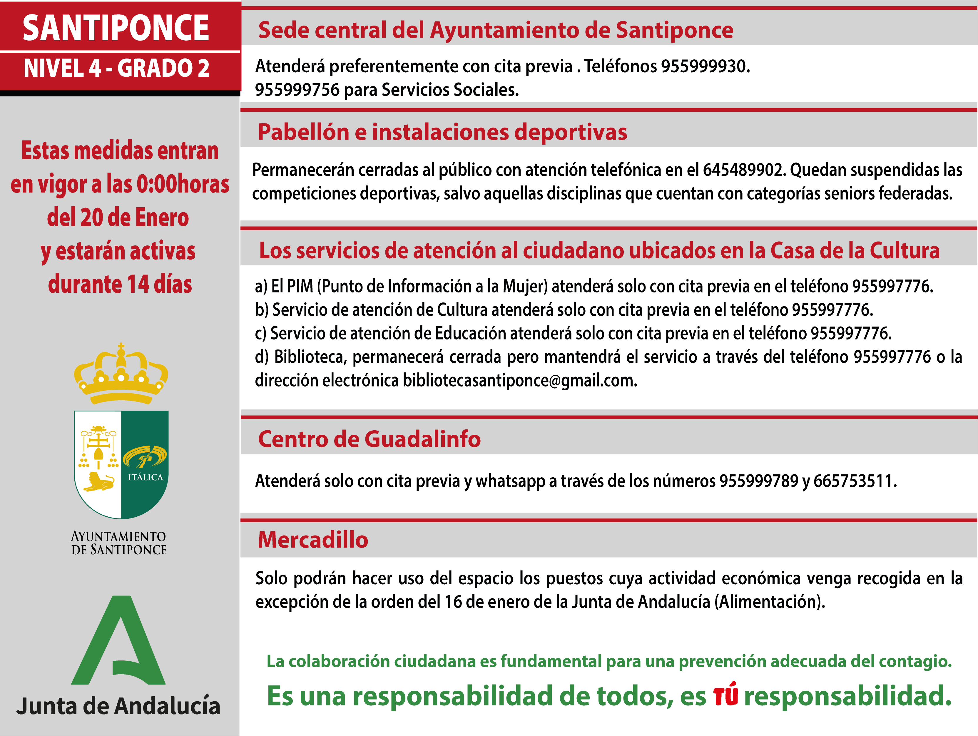 Desde el Ayuntamiento de Santiponce hacemos un llamamiento a la calma y a la tranquilidad de los ciudadanos y ciudadanas y pedimos que tomen estas normas con la responsabilidad que el momento sanitario nos requiere. c