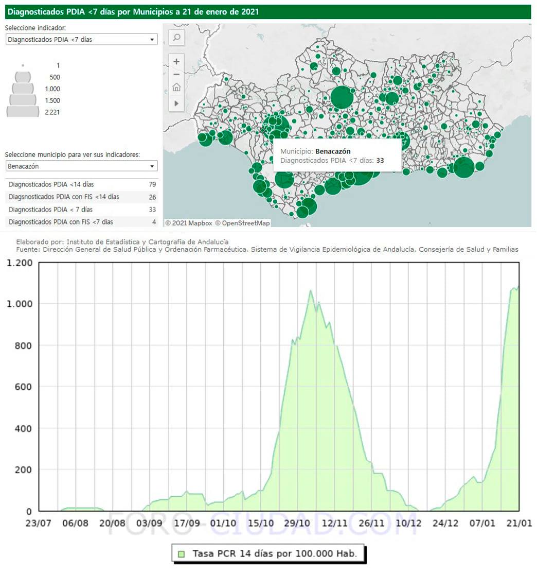 esde el Ayuntamiento de Benacazón trasladamos la información recogida en la página elaborada por la Consejería de Salud y Familias de la Junta de Andalucía, en colaboración con el Instituto de Estadística y Cartografía de Andalucía. Estos datos actualizados (a fecha 21 de enero) muestran 79 casos activos, 33 de ellos detectados durante la última semana, lo que corresponde a una Tasa PDIA de 1091.01 (casos por cada 100.000 habitantes), la más alta que ha tenido jamás Benacazón. Además, se informa de 6 fallecidos por Covid-19 desde el inicio de la pandemia.