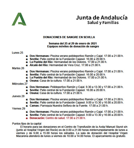 Desde el Ayuntamiento de Benacazón te informamos que en la tarde de hoy viernes 29 de enero de 2021, en horario de 17.00 a 21.00 horas, nuestro Consultorio Municipal quedará habilitado como punto de Donación de Sangre. Esta es una iniciativa organizada por la Hermandad de la Vera Cruz, que cuenta con la colaboración de la Junta de Andalucía y el Ayuntamiento de Benacazón en la cesión de espacios y la difusión.