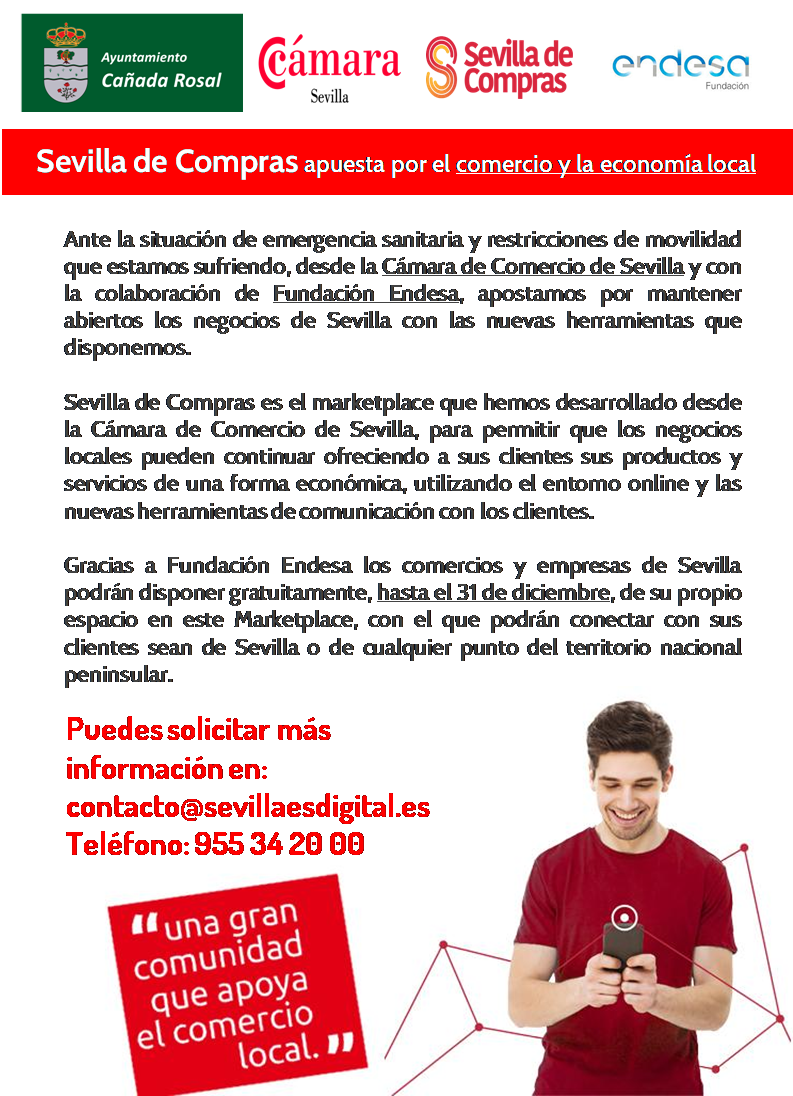 El Ayuntamiento de Cañada Rosal en colaboración con la Cámara de Comercio de Sevilla y siguiendo con las iniciativas de apoyo al comercio LOCAL de nuestra población, ofrece a todos los establecimientos comerciales que estén ubicados en el municipio puedan participar en el MarketPlace Sevilla de Compras.