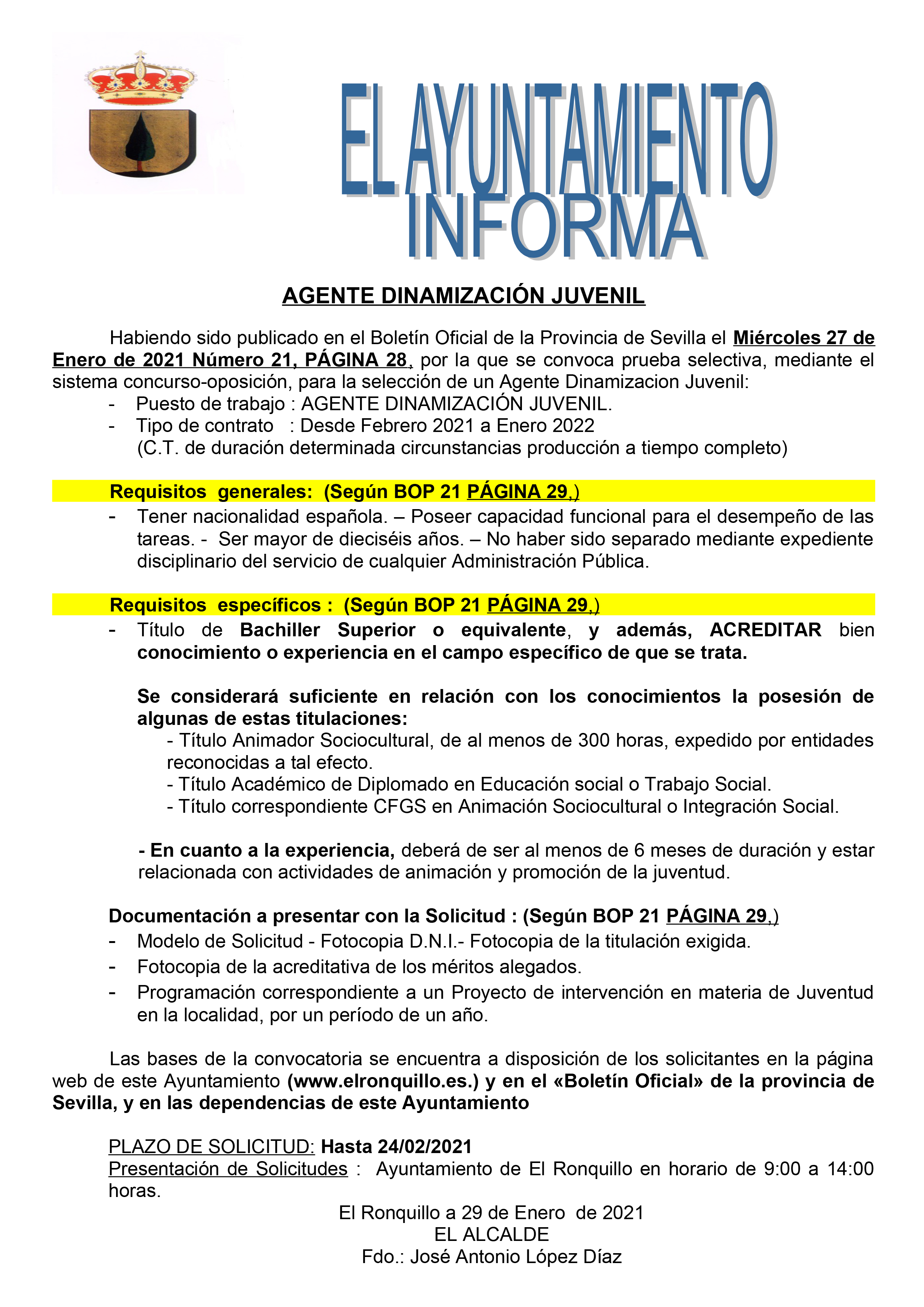 Continúa abierta la convocatoria para la selección de un Agente Dinamización Juvenil.