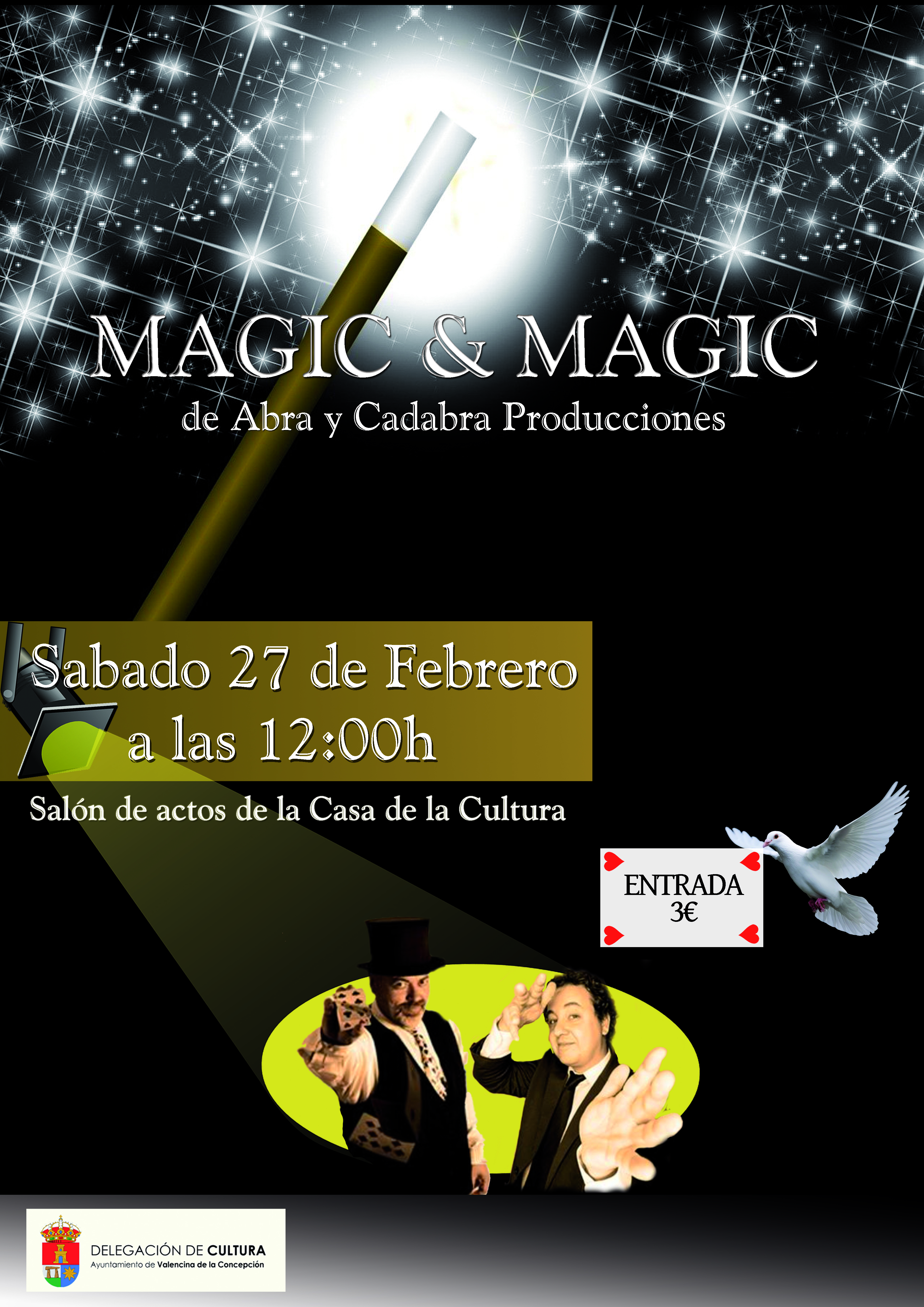 El Ayuntamiento de Valencina, a través de la delegación municipal de Cultura, organiza el próximo sábado 27 de febrero un espectáculo de magia para toda la familia, "Magic & Magic", un evento teatral basado en la magia, la comedia y la música.