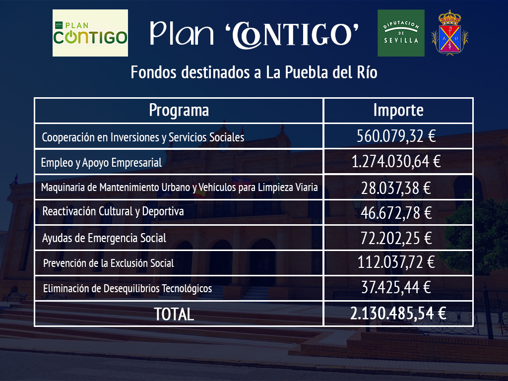 El Ayuntamiento de La Puebla del Río trabaja en los proyectos de las diferentes líneas que contiene el Plan Contigo de la Diputación de Sevilla, que destinará a la localidad cigarrera un total de 2,13 millones de euros que servirán para su recuperación económica tras la crisis provocada por la pandemia del Covid-19. Esta iniciativa se hace posible con el uso de los remanentes de tesorería provinciales autorizados por la supresión de las reglas fiscales aprobada por el Estado de la Nación.