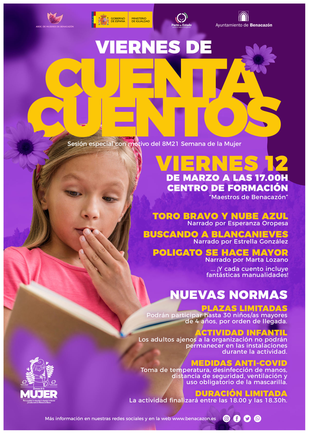 Desde el Ayuntamiento de Benacazón te informamos sobre la sesión especial de Viernes de Cuentacuentos, organizada por nuestras Áreas municipales de Infancia y Mujer e Igualdad con motivo de la 8M21 Semana de la Mujer. Esta sesión supuso el regreso de la actividad de forma presencial tras un año, en el que los narradores tuvieron que contar cuentos únicamente mediante vídeos en redes sociales.