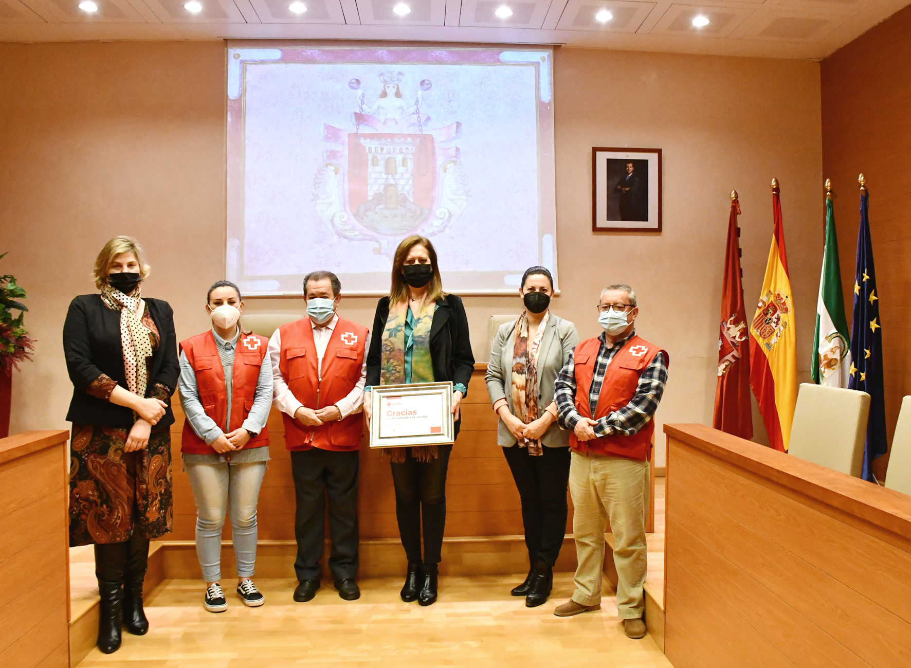 El presidente de la Asamblea Comarcal de Cruz Roja en Osuna, Manuel García, ha sido el encargado de entregarle este reconocimiento en forma de diploma en el que se agradece esta constante colaboración municipal en un acto que ha tenido lugar en el Salón de Plenos y que ha contado también con la presencia de las delegadas de Bienestar Social y de Participación Ciudadana, Brígida Pachón y Asunción Bellido, además de dos personas miembros de Cruz Roja, Alicia Díaz y Juan Navarro.