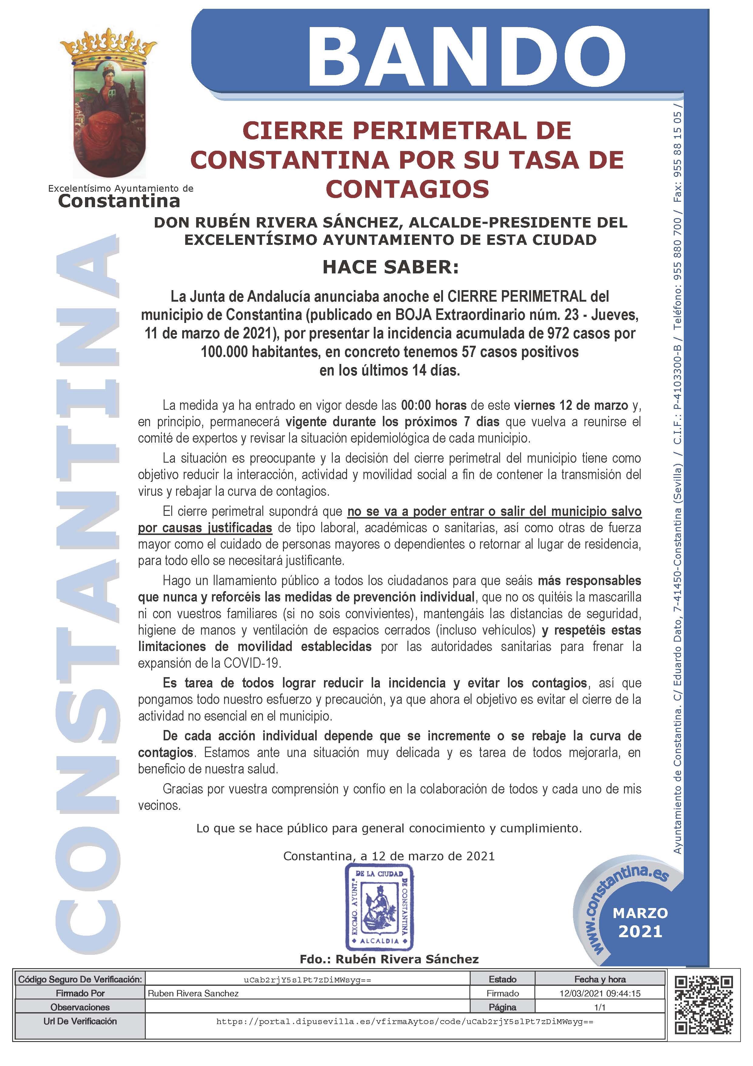 La Junta de Andalucía anunciaba anoche el CIERRE PERIMETRAL del municipio de Constantina (publicado en BOJA Extraordinario núm. 23 - Jueves, 11 de marzo de 2021), por superar la tasa de contagio por encima de los 500 casos por cada 100.000 habitantes (en concreto 972 casos por 100.000 habitantes, alcanzada con los 57 casos positivos en los últimos 14 días).