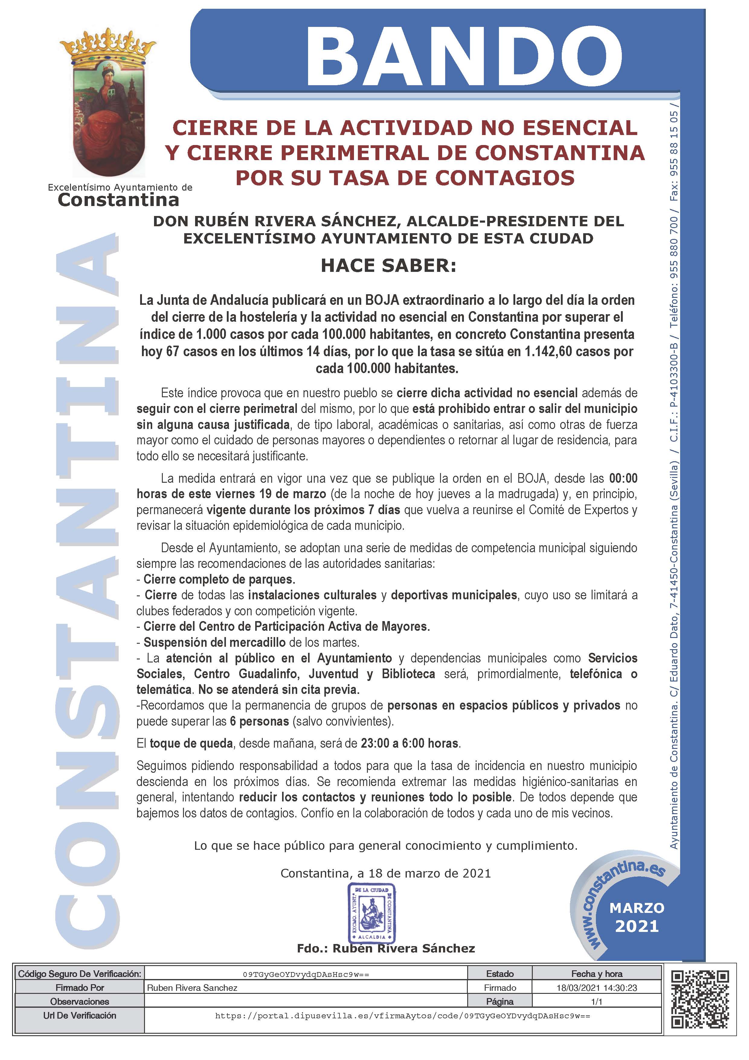 La Junta de Andalucía publicará en un BOJA extraordinario a lo largo del día la orden del cierre de la hostelería y la actividad no esencial en Constantina por superar el índice de 1.000 casos por cada 100.000 habitantes, en concreto Constantina presenta hoy 67 casos en los últimos 14 días, por lo que la tasa se sitúa en 1.142,60 casos por cada 100.000 habitantes.