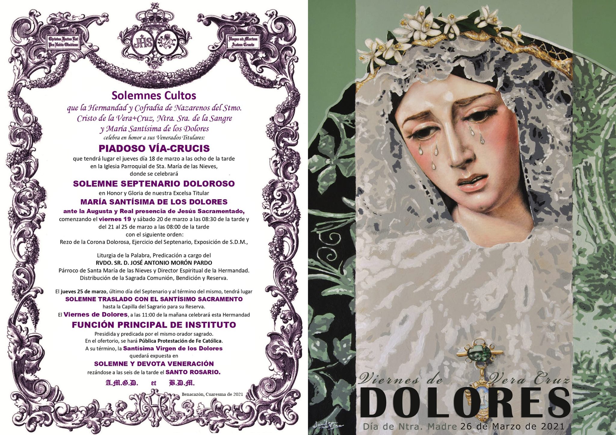 El Solemne Septenario Doloroso en Honor y Gloria de María Santísima de los Dolores ante la presencia de Jesús Sacramentado se celebrará durante siete días en la Iglesia Parroquial, predicado por el Reverendo Padre D. José Antonio Morón Pardo, Director Espiritual de la Hdad. El viernes 19 y el sábado 20 de marzo comenzará a las 20.30 horas, mientras que el resto de días, del domingo 21 al jueves 25 de marzo, comenzará a las 20.00 horas. El orden será Rezo de la Corona Dolorosa, Ejercicio del Septenario, Exposición de S.D.M., Liturgia de la Palabra, Predicación, Distribución de la Sagrada Comunión, Bendición y Reserva.