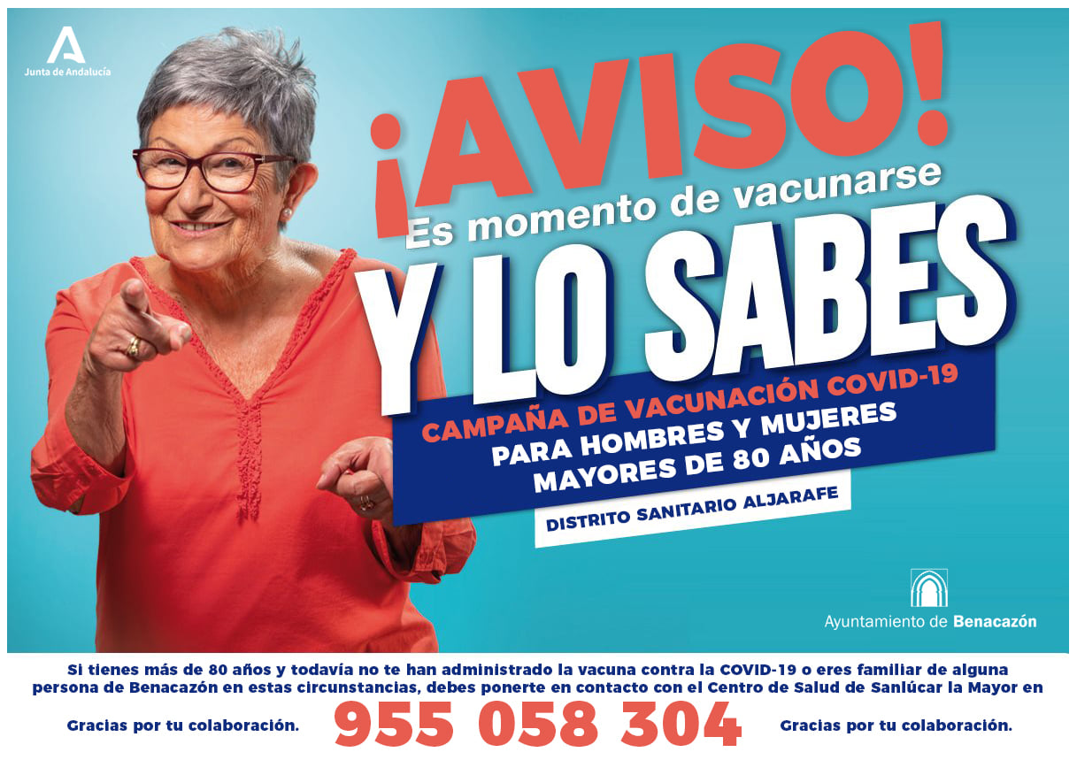 Con el objetivo de que ningún vecino se quede sin sus dosis de vacuna, te solicitamos que si tienes más de 80 años y no se ha vacunado aún contra la COVID-19 o eres familiar de alguna persona en esta situación, debe contactar con el Centro de Salud de Sanlúcar la Mayor en el teléfono 955 058 304. Desde el Ayuntamiento de Benacazón te agradecemos tu colaboración.