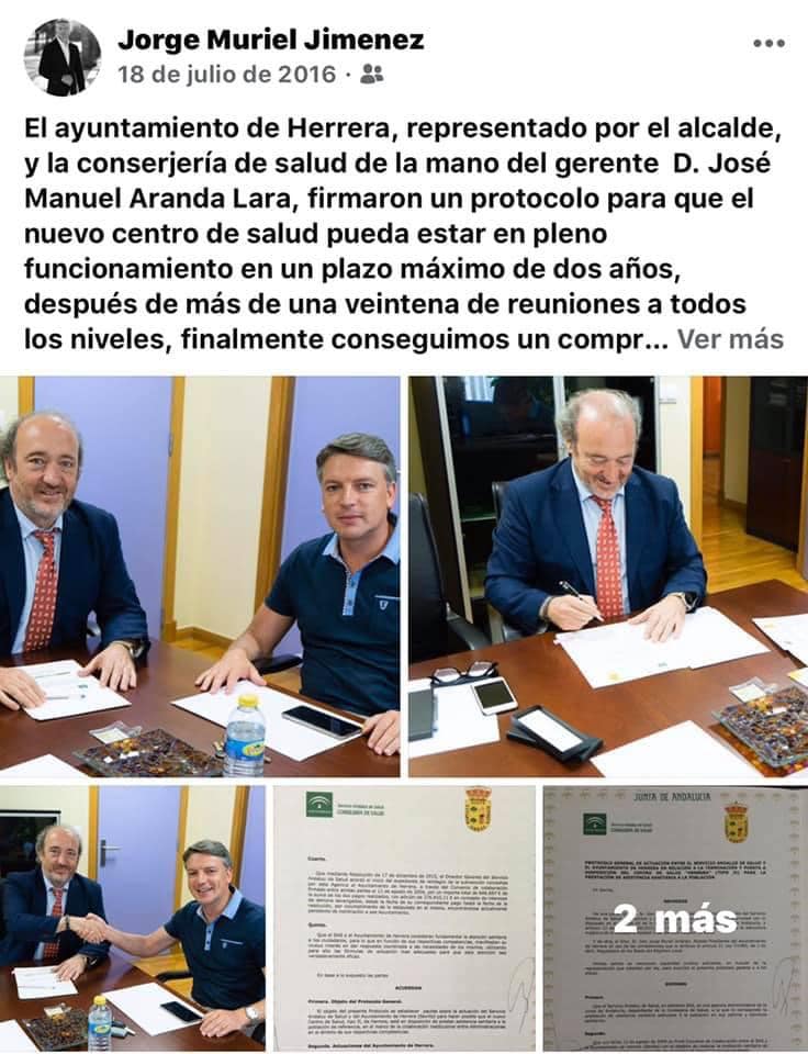 Han sido numerosas las gestiones realizadas en torno nuevo inmueble de atención primaria, tal como se ha expuesto antes, y se han realizado importantes negociaciones que tienen su máxima expresión en la cesión que se efectuó a la Junta de Andalucía del inmueble, y muy particularmente el acuerdo entre las partes para la adquisición del inmueble por parte de la administración autonómica, que supondrá un importante ingreso económico al Ayuntamiento de Herrera. Igualmente esta administración está en permanente contacto y negociaciones con la Consejería de Salud y el SAS para que el cambio de la calificación, ciertamente las conversaciones están avanzadas pero lamentablemente la situación de pandemia por el Covid-19, imposibilita impulsar como todos quisiéramos este asunto, dado que al igual que todas las administraciones casi todos los esfuerzos en todos los ámbitos se dirigen a la lucha contra la terrible pandemia que azota a la humanidad.
