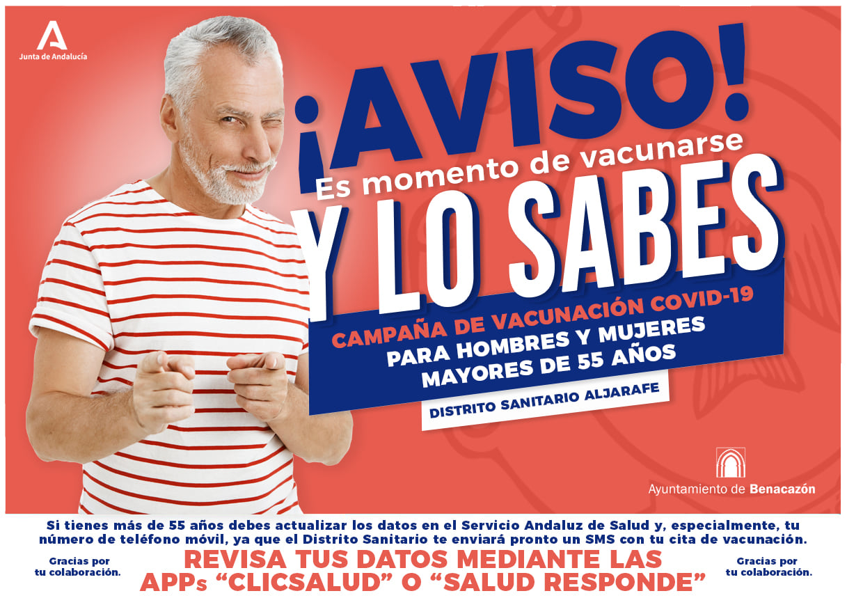 Con el objetivo de que ningún vecino se quede sin sus dosis de vacuna, te solicitamos que si tienes más de 80 años y no se ha vacunado aún contra la COVID-19 o eres familiar de alguna persona en esta situación, debe contactar con el Centro de Salud de Sanlúcar la Mayor en el teléfono 955 058 304. Desde el Ayuntamiento de Benacazón te agradecemos tu colaboración.
