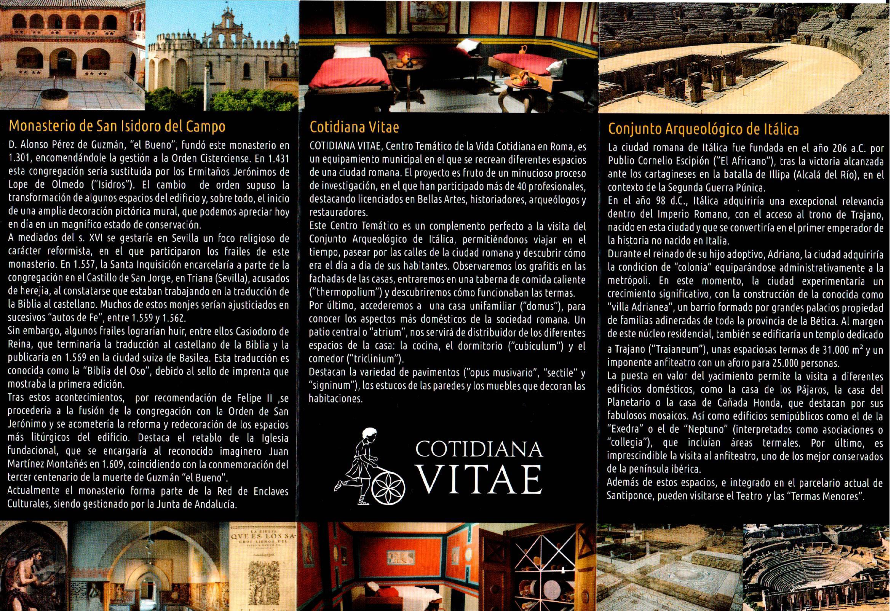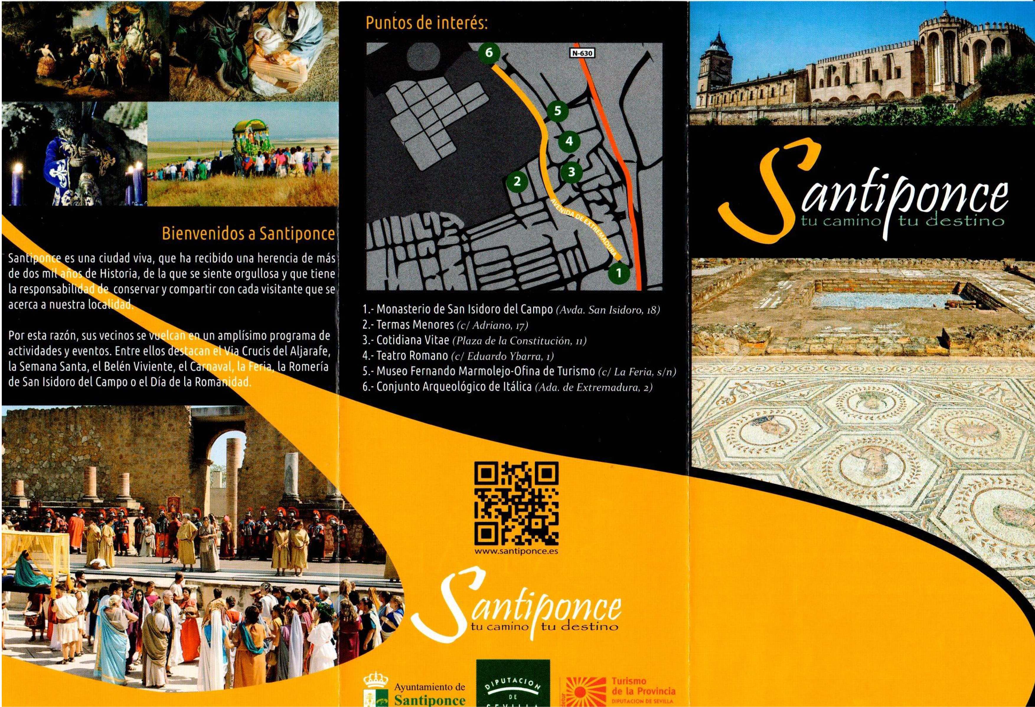 Ya está disponible, tanto en formato digital como físico, el nuevo folleto turístico de Santiponce elaborado desde la Delegación de Turismo del Ayuntamiento de Santiponce, dentro del marco de colaboración con PRODETUR. Dicho folleto de promoción local cuenta con información sobre diferentes puntos turísticos de interés del municipio: el Monasterio de San Isidoro del Campo, el centro de interpretación Cotidiana Vitae y el Conjunto Arqueológico de Itálica.