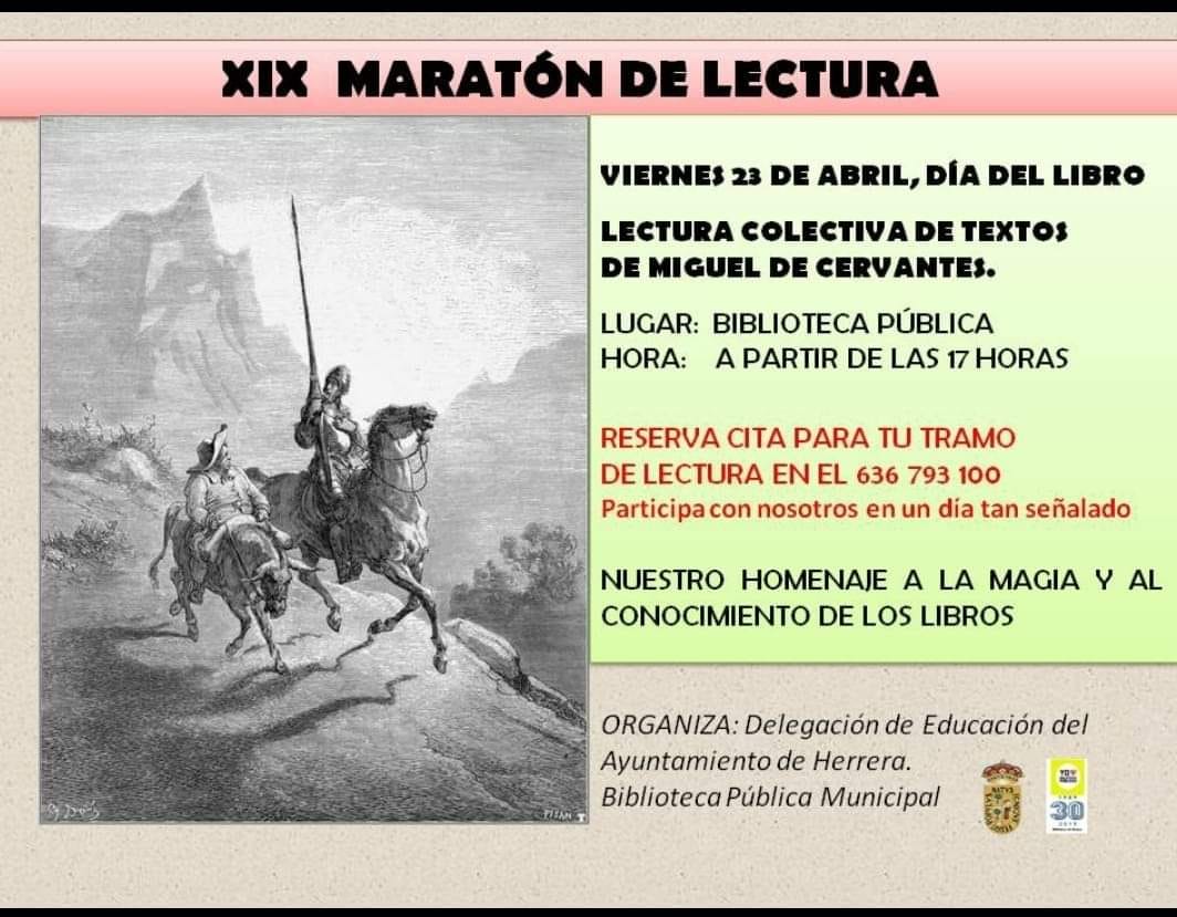 Para el viernes 23 de Abril, Día Internacional del Libro, os proponemos una nueva edición de nuestro tradicional Maratón de Lectura dedicado al gran maestro Miguel de Cervantes. Se trata de realizar una lectura en común de textos cervantinos adaptados a cada grupo de edad. Necesitamos vuestra colaboración para realizar este homenaje a una herramienta clave en nuestra historia y evolución, el libro, con un esplendoroso pasado, un brillante presente y un imprescindible futuro en positivo. Reserva tu tramo de lectura en los números 636 793 100 o 95401 36 56. Abierto a todo tipo de público. Este año se realizará en la Biblioteca Pública a partir de las 17 horas del día mencionado. ¡Os esperamos!