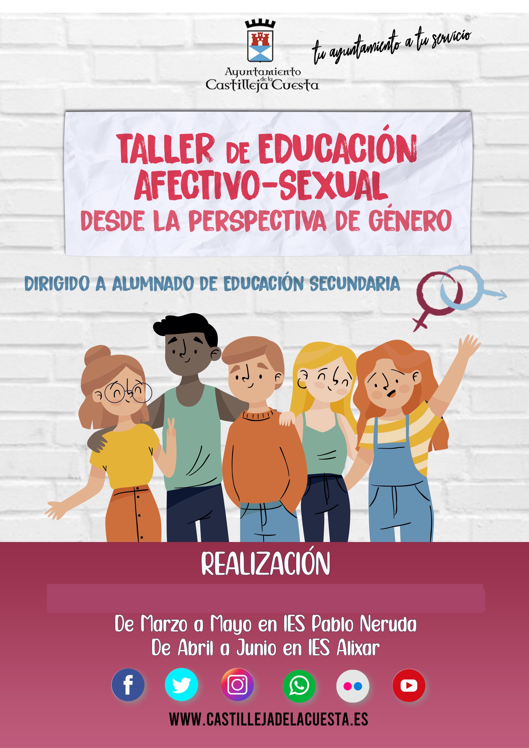 El Ayuntamiento está desarrollando talleres de educación afectivo-sexual desde la perspectiva de género, dirigidos al alumnado de Educación Secundaria de los institutos del municipio, de forma presencial y on line, según la preferencia mostrada por los centros participantes. Estos talleres se están impartiendo al alumnado de 3º y 4º de E.S.O. y participará una línea completa por centro.