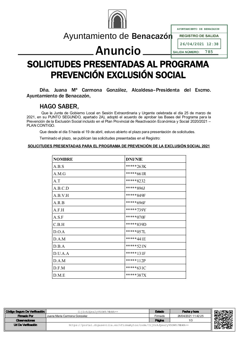Desde el Ayuntamiento de Benacazón te informamos que la Junta de Gobierno Local, en Sesión Extraordinaria y Urgente celebrada el día 25 de marzo de 2021, en su punto segundo, apartado 2A, aprobó las Bases del Programa para la Prevención de la Exclusión Social, incluido en el Plan Provincial de Reactivación Económica y Social 2020/2021, conocido como el Plan Contigo.