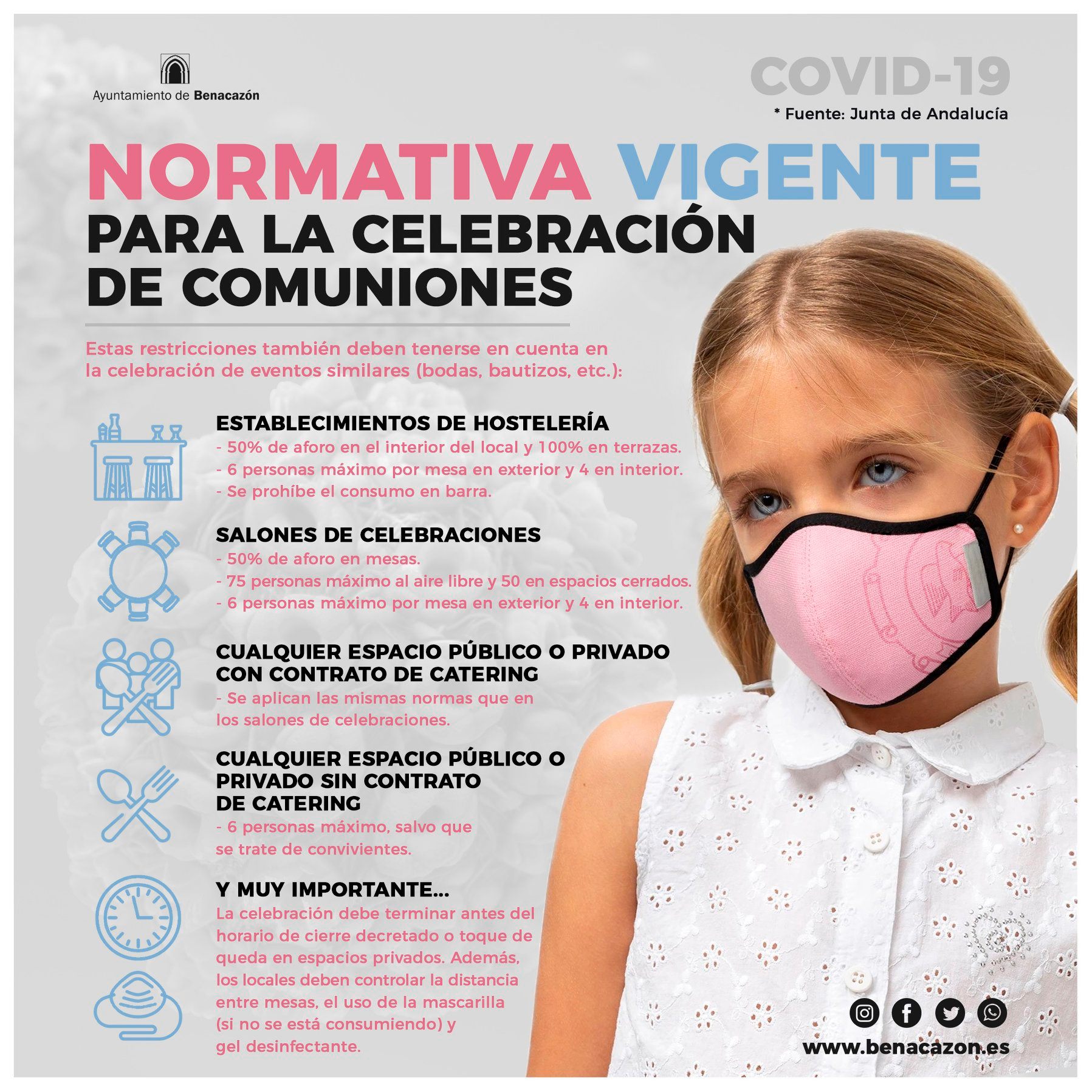 Desde el Ayuntamiento de Benacazón te informamos sobre las medidas y restricciones actuales en cuanto a la celebración de Comuniones y eventos similares (bodas, bautizos, cumpleaños…) en nuestra comunidad. Esta normativa aprobada por la Junta de Andalucía está vigente desde principios de abril, cuando se reunió el Comité de Expertos de la Junta para decidir cuáles serían las medidas para contener la propagación de infecciones causadas por la COVID-19 en la autónoma. En la reunión se abordaron las "celebraciones posteriores a ceremonias nupciales u otras celebraciones religiosas o civiles", que deben adaptarse a la Orden del 29 de octubre de 2020.