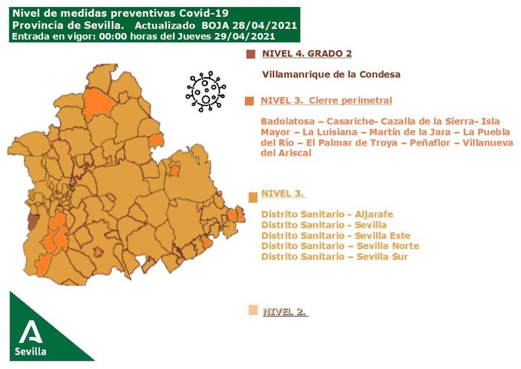 Este es el mapa de Sevilla de niveles preventivos por distritos sanitarios, en vigor desde hoy.