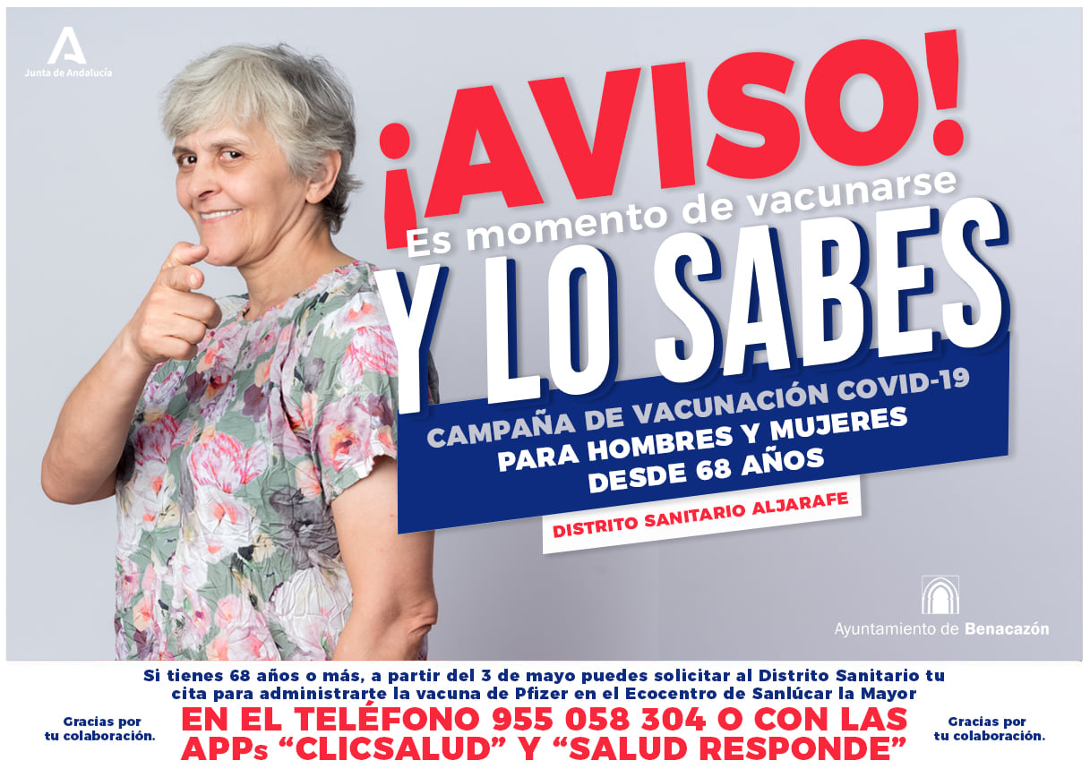 Desde el Ayuntamiento de Benacazón te informamos sobre los avances en la Campaña de Vacunación de la COVID-19 en nuestra comunidad autónoma. Desde nuestro Área municipal de Salud recordamos a todos los vecinos de nuestro pueblo que las vacunas contienen todas las garantías de calidad, seguridad y eficacia que deben tener los medicamentos que se autorizan en la Unión Europea y que disponer de ella es de vital importancia.