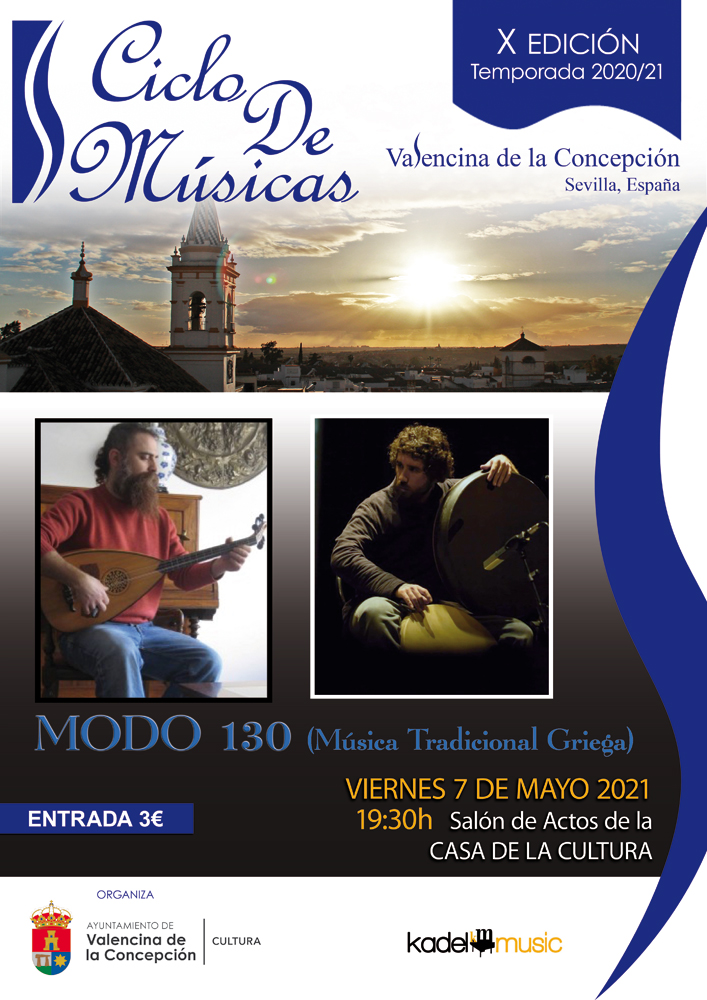 La actuación corre a cargo de "Modo 130", grupo musical formado en 2010 por los músicos Christos Kanellos y David Ruiz. Abarca diferentes estilos musicales, como la música clásica, tradicional. oriental, griega, turca, sefardita, entre otras; todas ellas, bajo el prisma común de la improvisación. El presente concierto servirá asimismo para presentar el disco "Anemis", así como algunas nuevas composiciones.