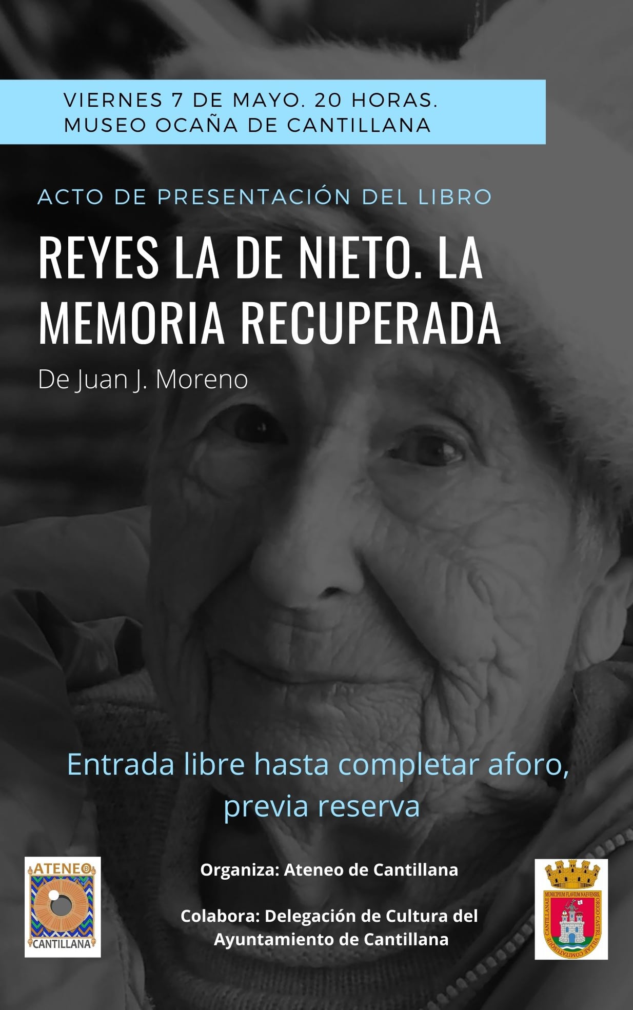 El próximo viernes 7 de mayo, a las 20 horas, en el Museo Ocaña, el Ateneo de Cantillana organizará el acto de presentación del libro "Reyes la de Nieto. La memoria recuperada", de Juan J. Moreno. Dicho evento contará con la colaboración de la Delegación de Cultura De Cantillana . El fallecimiento de Reyes la de Nieto durante el confinamiento provocado por la pandemia permite que vea la luz un libro de memorias que comenzó a escribir al enviudar a los 78 años de edad. Este descubrimiento, por parte de su hijo, destaca aspectos que desconocía de la vida de su madre. Una vida de superación y lucha por unos derechos (los de la infancia, los de la mujer...) que le fueron denegados. Diagnosticada de Alzheimer en los últimos años de su vida, es la lucha de una mujer por no caer en el olvido. Entrada libre hasta completar aforo, previa reserva. Los interesados en asistir pueden enviar un Whatssap al teléfono 679823617 en el que faciliten su nombre, apellidos y DNI (por protocolo Covid-19).