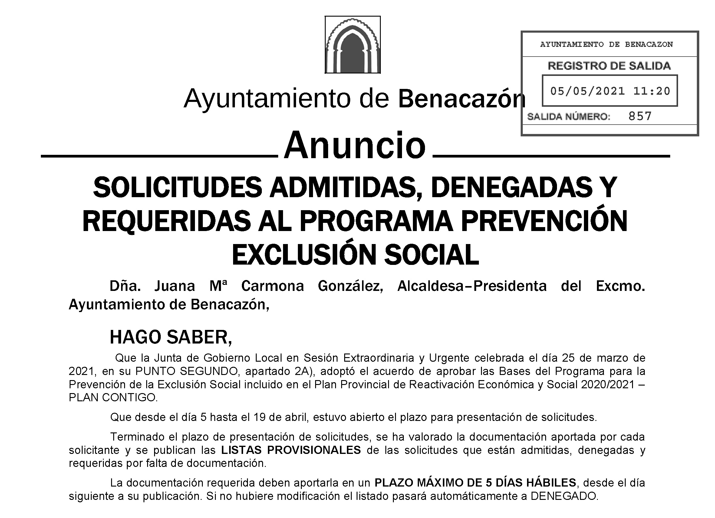 Desde el Ayuntamiento de Benacazón informamos que la Junta de Gobierno Local en Sesión Extraordinaria y Urgente celebrada el día 25 de marzo de 2021, en su punto segundo apartado 2A, adoptó el acuerdo de aprobar las Bases del Programa para la Prevención de la Exclusión Social (PES) incluido en el Plan Provincial de Reactivación Económica y Social 2020/2021, llamado Plan Contigo.