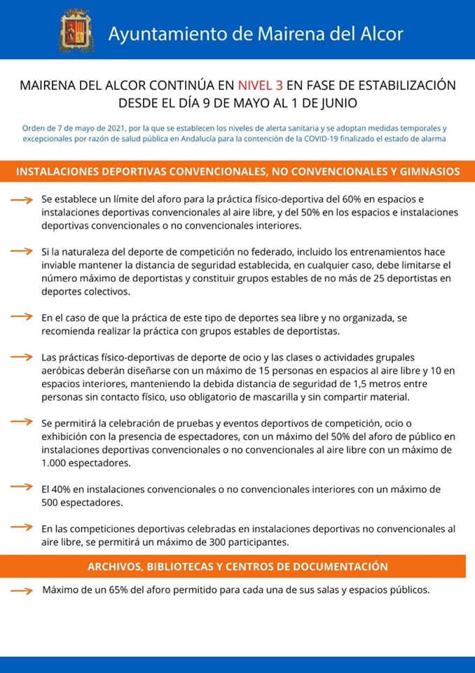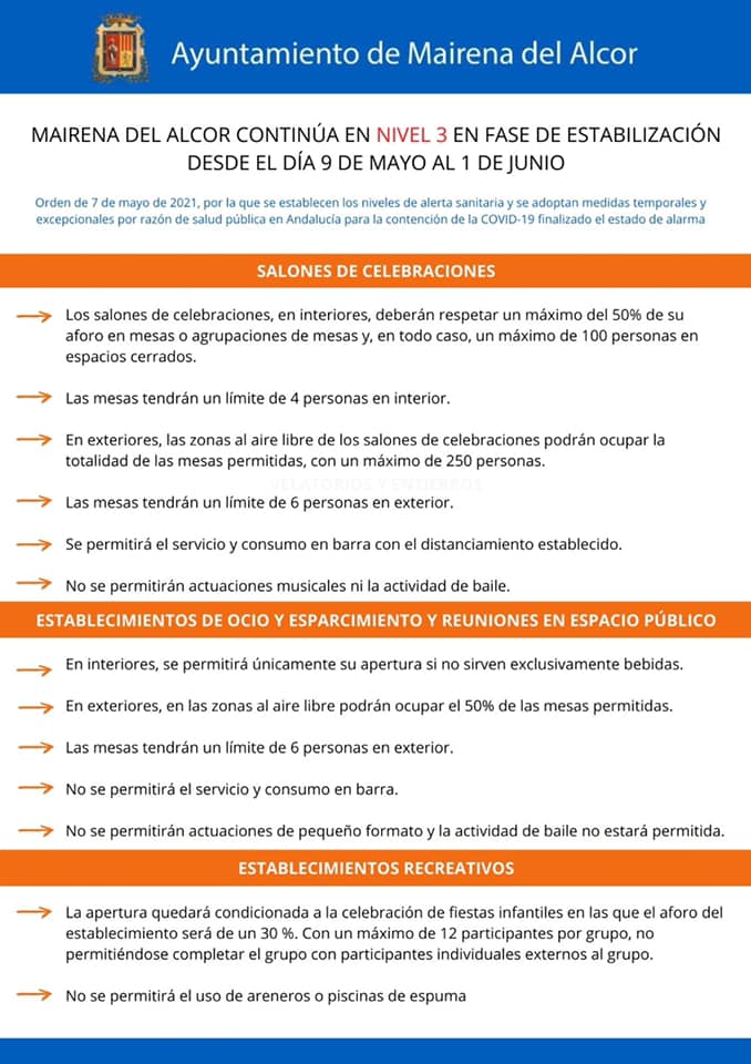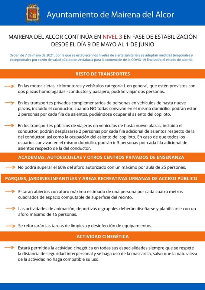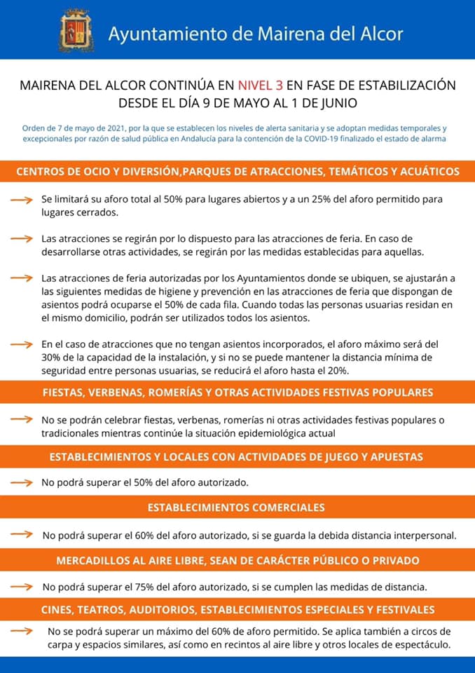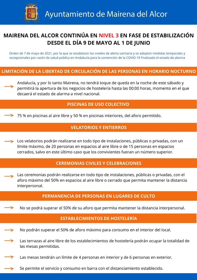 Nuevas medidas a cumplir en Mairena del Alcor del Alcor, según la Orden de 7 de mayo de 2021, por la que se establecen los niveles de alerta sanitaria y se adoptan medidas temporales y excepcionales por razón de salud pública en Andalucía para la contención de la COVID-19 finalizado el estado de alarma.