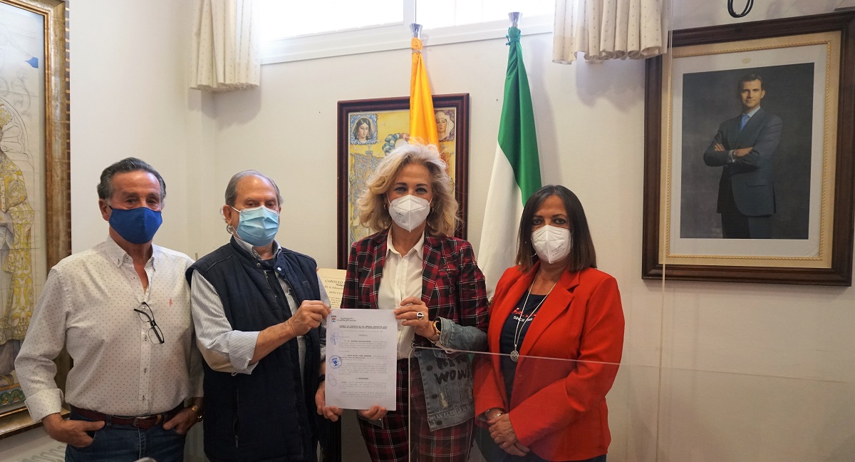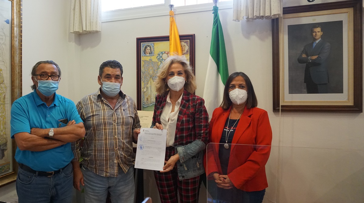 La alcaldesa y la delegada de Bienestar Social, junto a representantes del Centro de Pensionistas Colón, situado en la Plaza la Paz