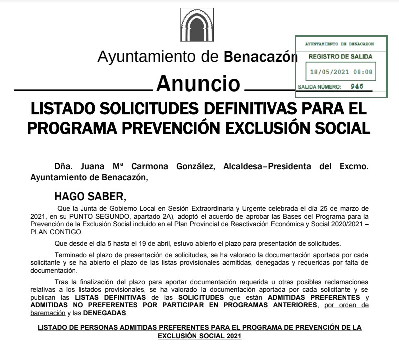 Desde el Ayuntamiento de Benacazón te informamos que la Junta de Gobierno Local, en Sesión Extraordinaria y Urgente celebrada el día 25 de marzo de 2021, en su punto segundo, apartado 2A, adoptó el acuerdo de aprobar las Bases del Programa para la Prevención de la Exclusión Social, incluido en el Plan Provincial de Reactivación Económica y Social 2020/2021, más conocido como el Plan Contigo.