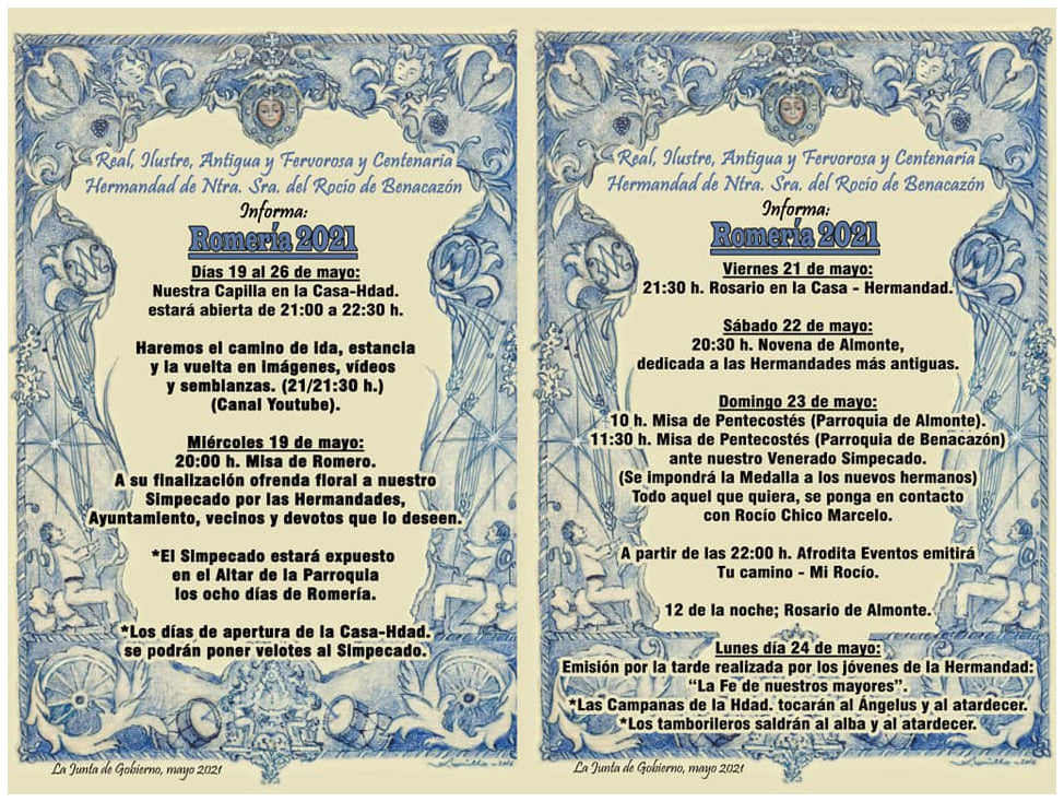 En la publicación de la Junta de Gobierno de la Hermandad en redes sociales, se comunica que "nos complace informaros que, tras la mejora de las medidas restrictivas y las debidas autorizaciones, la Hermandad del Rocío de Benacazón podrá llevar a cabo una serie de actos para celebrar este Rocío de Esperanza. Actos que se han preparado con mucho cariño con el objetivo de engrandecer más aún si cabe a esta institución centenaria durante la semana de romería. Esperamos vuestra participación en todos ellos, que no dudamos que así será, como se viene demostrando".