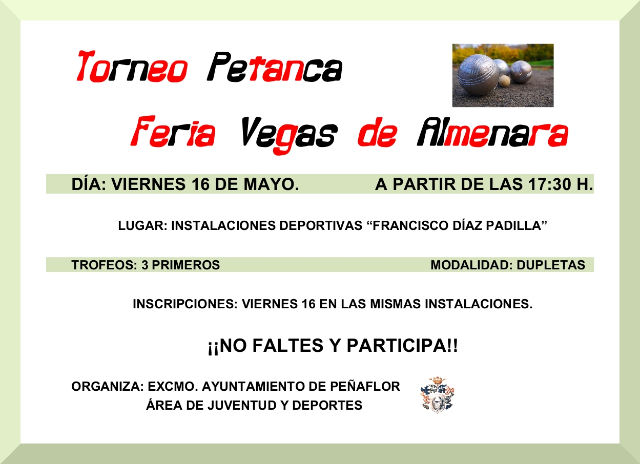 Imagen Ubicación Categoría noticia Deporte Mostrar en el carrusel de la sección No Fecha Vie, 16/05/2014 - 17:30 Más información http://www.penaflor.es/es/actualidad/noticias/TORNEO-DE-PETANCA-FERIA-VEGAS-DE-…