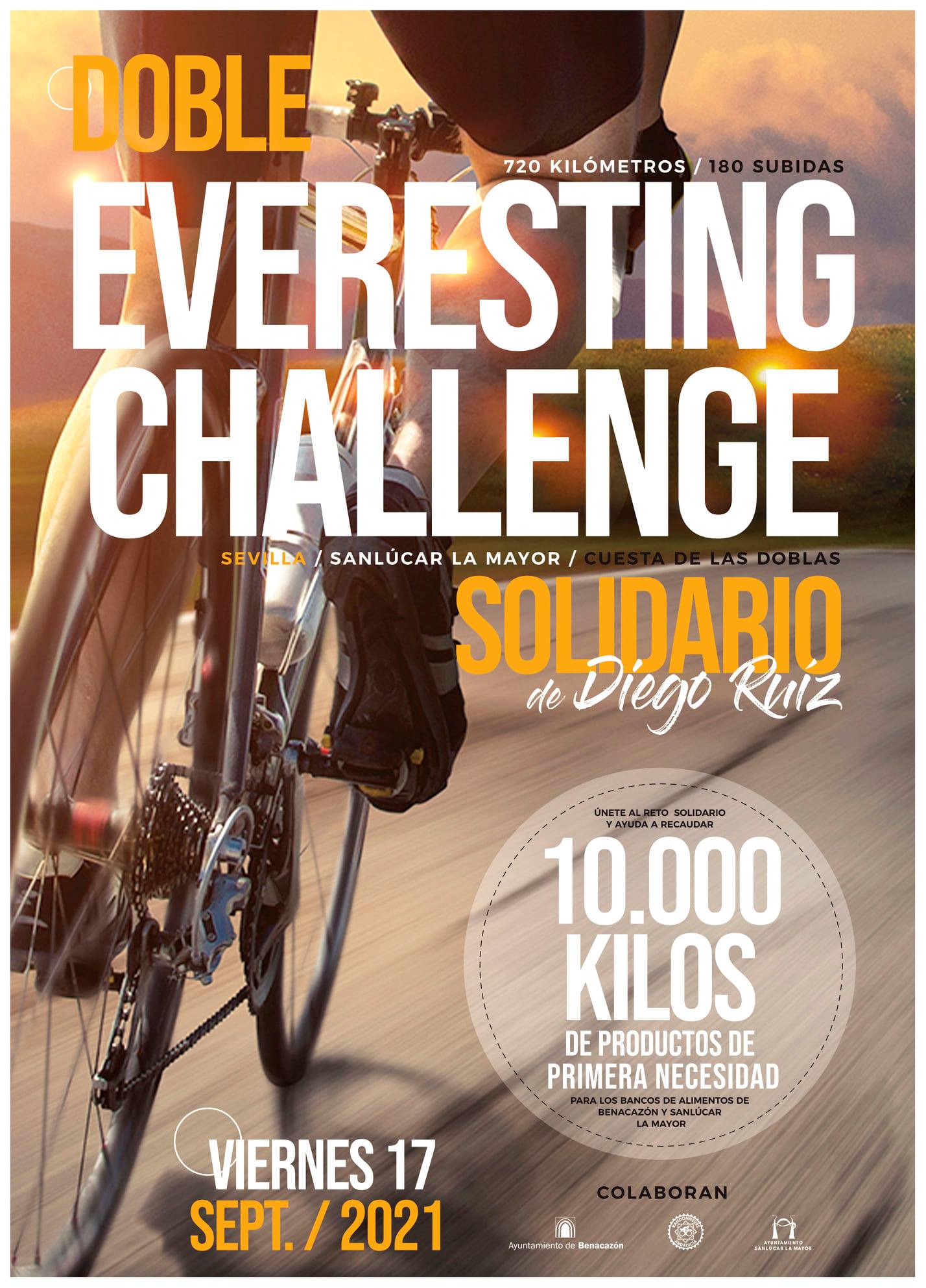 Desde el Ayuntamiento de Benacazón te informamos sobre el Doble Everesting Challenge Solidario de Diego Ruiz, un reto ciclista que tendrá lugar el viernes 17 de septiembre de 2021 en la Cuesta de las Doblas de Sanlúcar la Mayor, donde el ciclista realizará las 180 subidas necesarias para superar dos veces el desnivel de 8.848 metros que posee el Everest, la montaña más alta del planeta Tierra. Para ello tendrá que recorrer en torno a 720 kilómetros y permanecer en la bicicleta unas 60 horas.