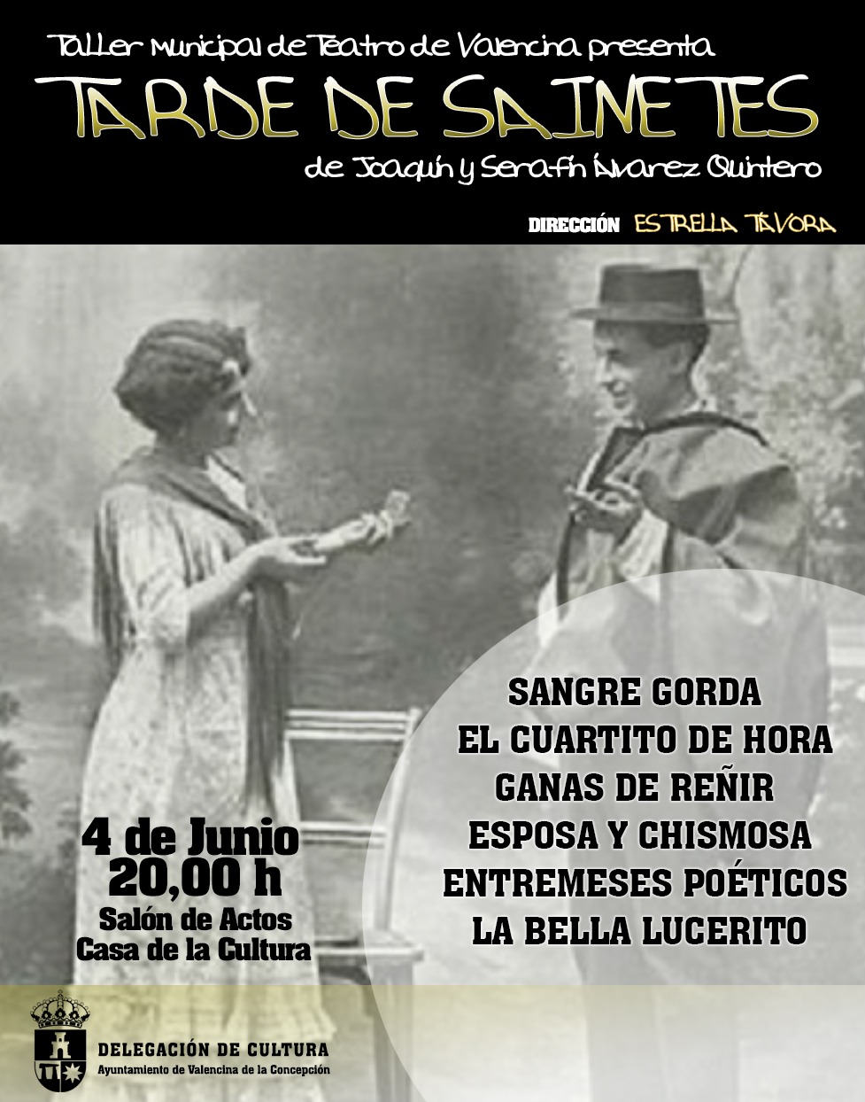 Con el título "Tarde de Sainetes" el Taller de Teatro de Valencina, bajo la dirección de Estrella Távora, llevará a escena algunas de las más célebres obras de esta clase escritas por los hermanos Joaquín y Serafín Álvarez Quintero. En la programación se incluyen piezas como Sangre gorda, El cuartito de hora, Ganas de reñir, Entremeses poéticos o La Bella Lucerito.