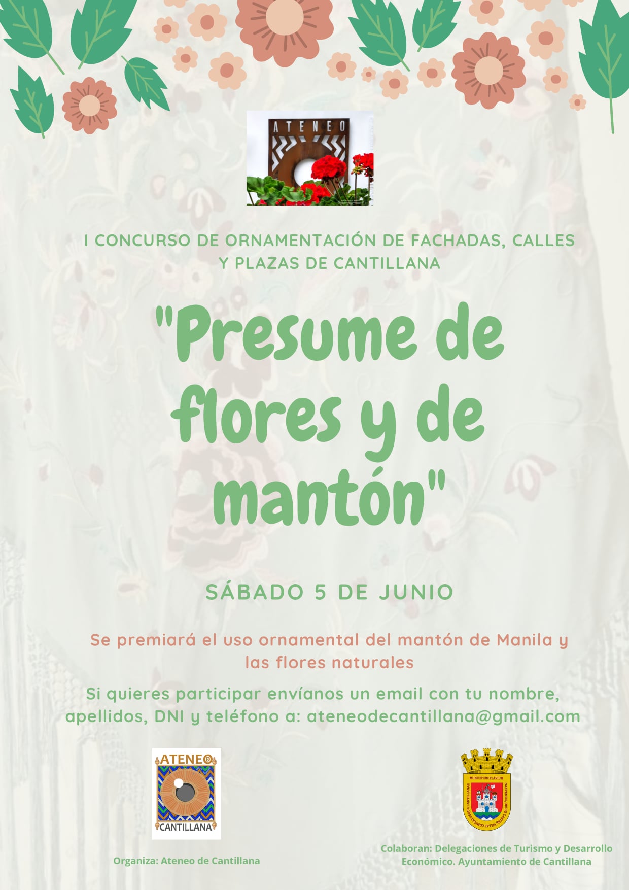 El Ateneo de Cantillana, en colaboración con las delegaciones de Turismo y Desarrollo Económico del Ayuntamiento, organiza el I Concurso de Ornamentación de Fachadas, Calles y Plazas bajo el nombre de 'Presume de flores y de mantón', que tendrá lugar el sábado 5 de junio.