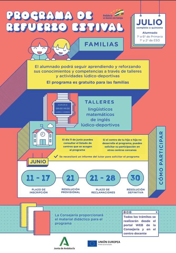 La Delegación de Educación del Ayuntamiento de Mairena del Alcor difunde la convocatoria del Programa Refuerzo Educativo en Período Estival, que la Consejería de Educación y Deporte implementa en los centros docentes públicos de Andalucía de manera gratuita y proporcionando los materiales necesarios.