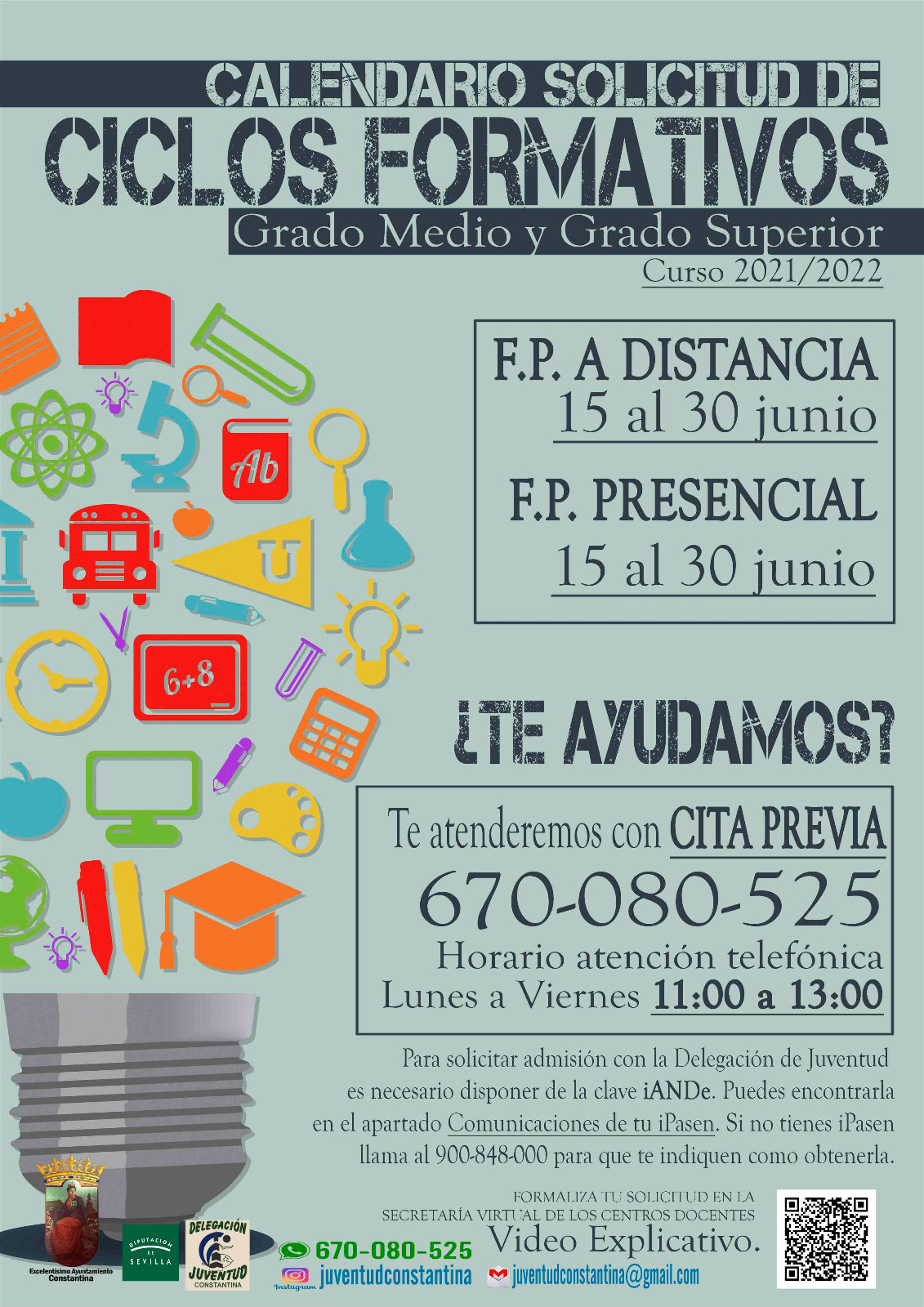 Desde la Delegación de Juventud del Ayuntamiento de Constantina se atenderá a todo aquel que necesite ayuda. La orientación se hará de forma telefónica en el 955133343 con CITA PREVIA. Horario telefónico de 11:00 a 13:00 horas.