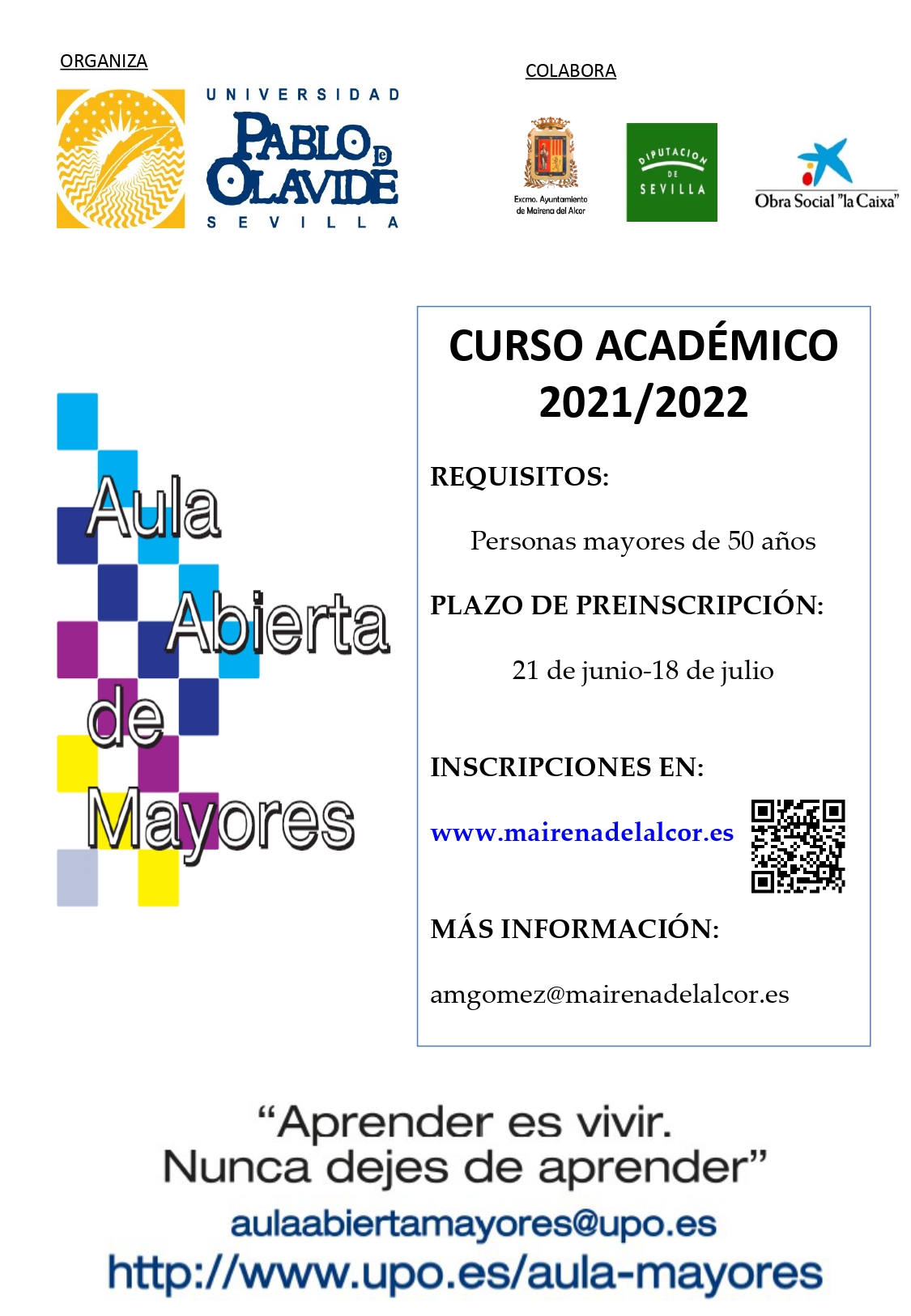 Desde hoy lunes 21 de junio y hasta el 18 de julio se podrá realizar la preinscripción al Aula Abierta de Mayores de la Universidad Pablo Olavide en Mairena del Alcor.