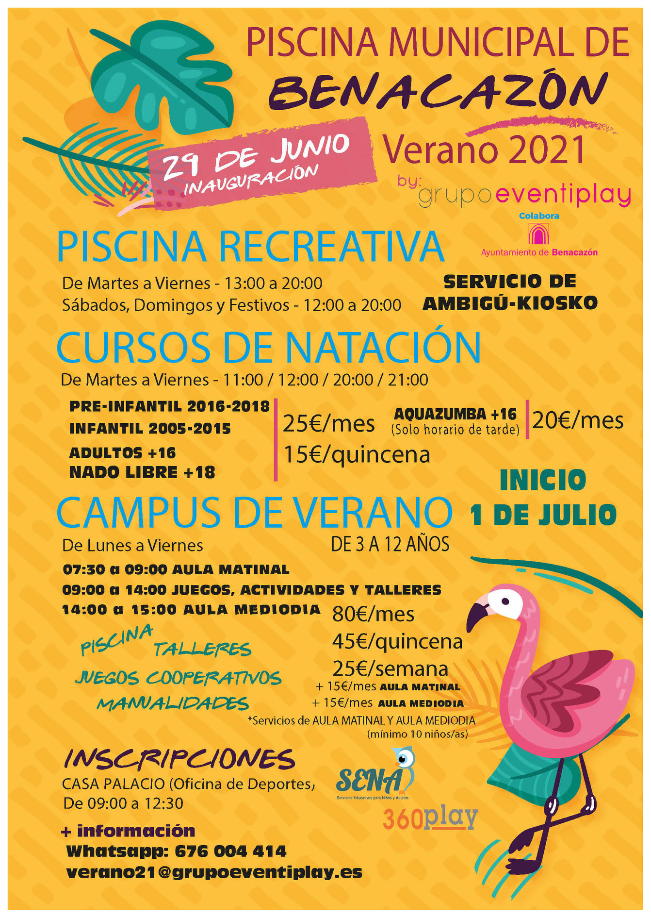 Desde el Ayuntamiento de Benacazón te informamos sobre los servicios de la nueva temporada de la Piscina Municipal de Verano, que gestiona la empresa Grupo Eventiplay Sevilla con el apoyo del Área municipal de Deportes, cuya inauguración tendrá lugar el martes 29 de junio de 2021.