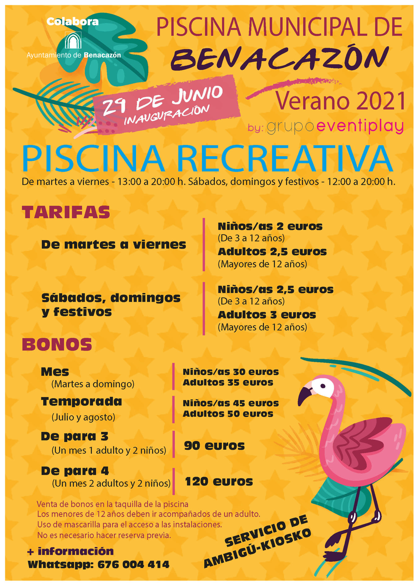TARIFAS Y ABONOS DEL SERVICIO RECREATIVO DE LA PISCINA MUNICIPAL DE VERANO DE BENACAZÓN, TEMPORADA 2021
