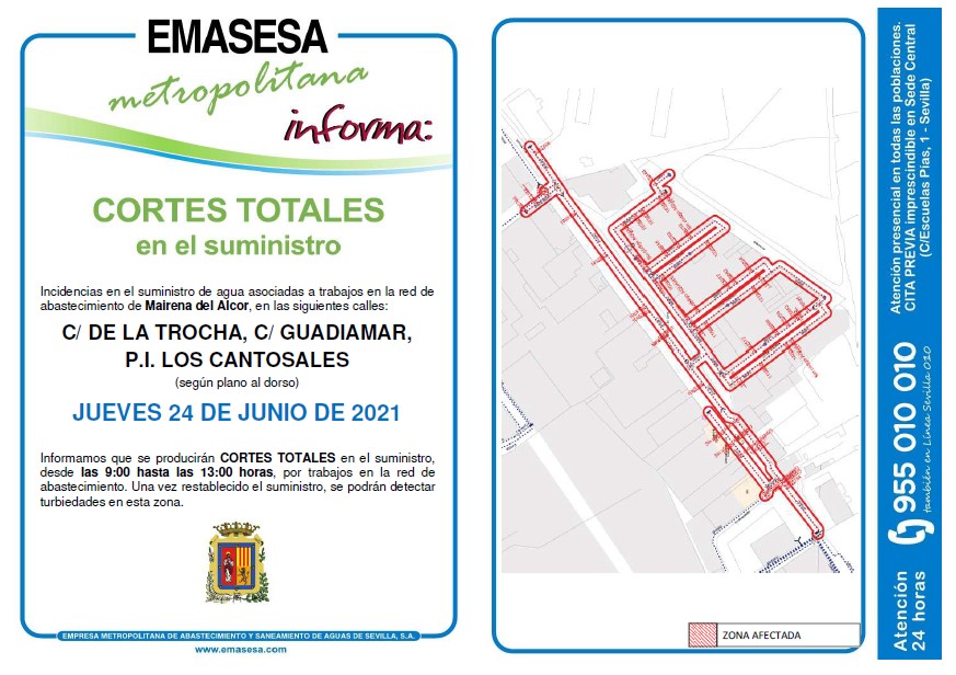 Emasesa Metropolitana informa que por trabajos en la red de abastecimiento, el jueves día 24 de junio, de 9 a 13 horas, se producirán cortes totales en el suministro de agua en la zona comprendida por avenida de la Trocha, calle Guadiamar y el polígono industrial los Cantosales.