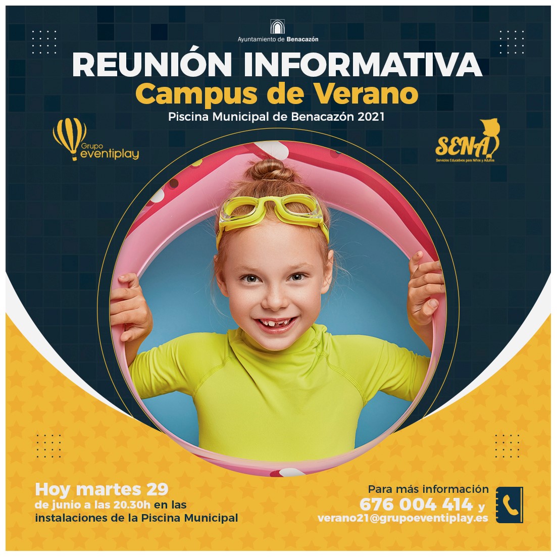 Esta reunión tendrá lugar hoy martes 29 de junio a las 20.30 horas en las instalaciones de la Piscina Municipal. Desde la organización se ruega asistencia de un adulto por niño/a inscrito/a, mantener la distancia de seguridad y uso responsable de la mascarilla. Este Campus de Verano estará disponible de lunes a viernes para niños y niñas de 3 a 12 años. Además, contará con Aula Matinal y de Mediodía. Accede al modelo de inscripción de SENA Servicios Educativos en el siguiente enlace https://forms.gle/Cmx5zbp3aQZST1PK6 Para más información, contacta en el whatsapp 676 004 414 y en el correo verano21@grupoeventiplay.esImagen