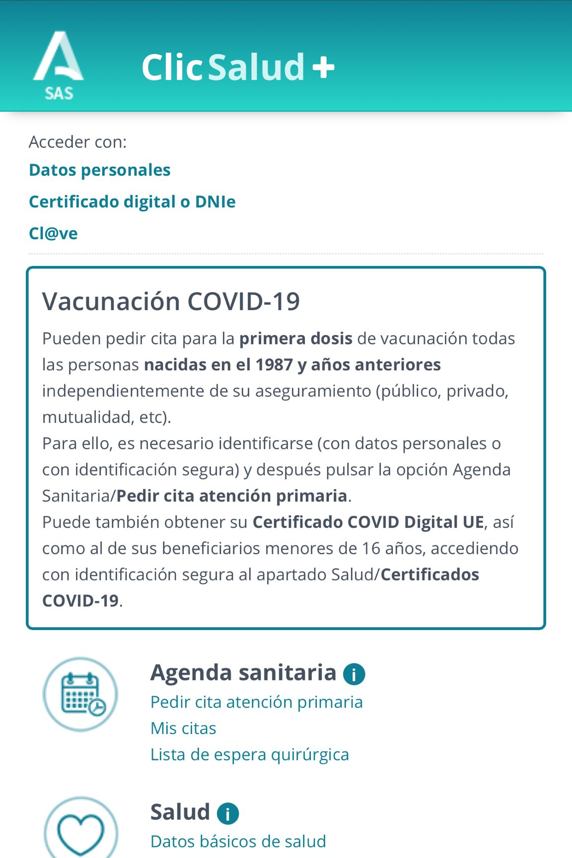 La Delegación de Salud informa que desde hoy martes 6 de julio, las personas nacidas en el año 1987 que este año cumplen 34 años, pueden pedir cita para la primera dosis de la vacuna contra la COVID-19, directamente a través de las plataformas ClicSalud y Salud Responde (http://lajunta.es/341ek).