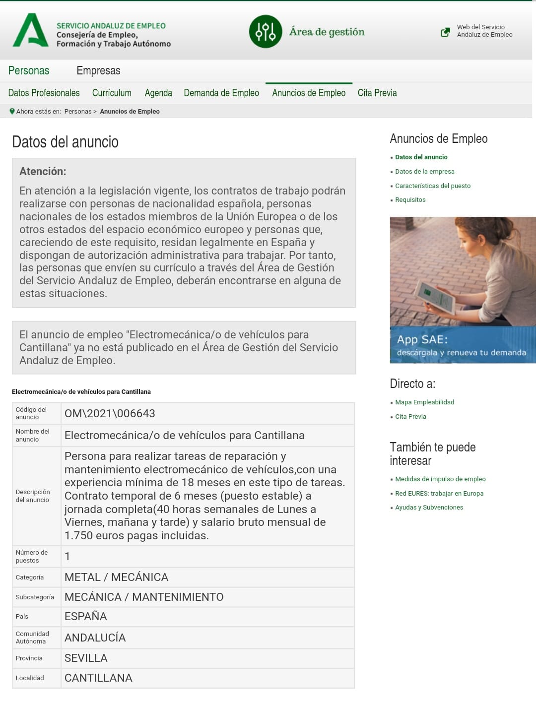 El Servicio Andaluz de Empleo ha hecho público el anuncio de una oferta de empleo de electromecánica/o de vehículos en Cantillana.
