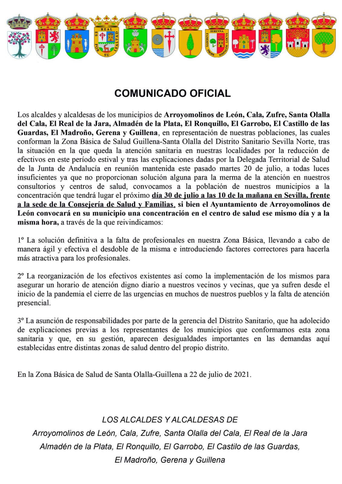 Adjuntamos comunicado oficial de todos/as los/as Alcaldes/as de la Zona Básica de Salud Guillena-Santa Olalla del Distrito Sanitario Sevilla Norte.