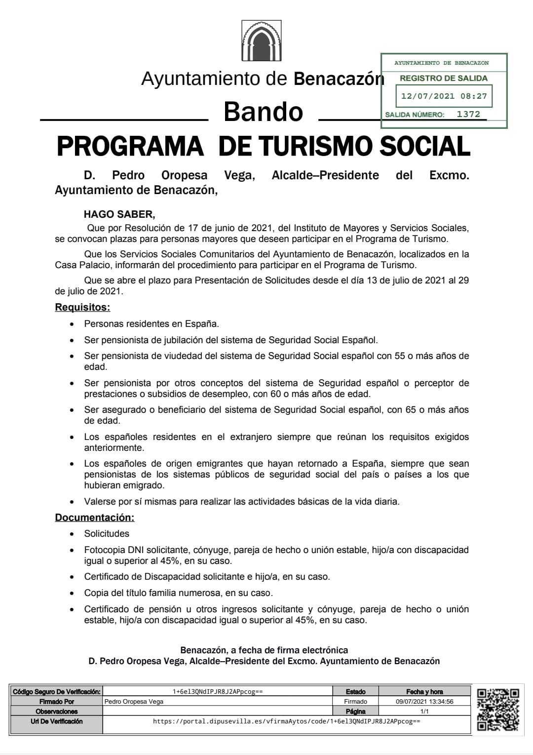 En el BANDO adjunto, puedes consultar los Requisitos y Documentación necesarios para poder participar en el citado Programa de Turismo Social, destinado a nuestros mayores.