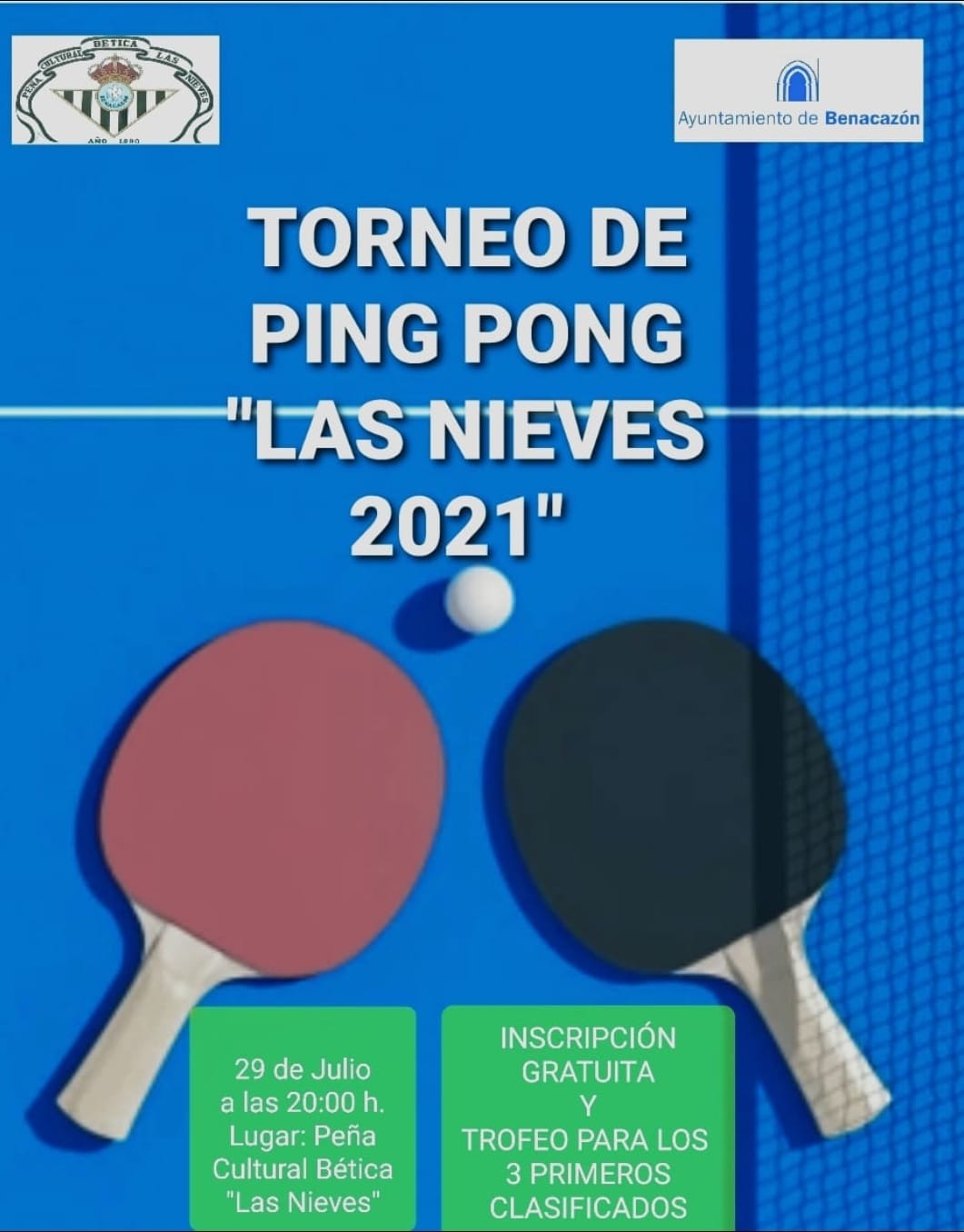 El Ayuntamiento de Benacazón organiza un Torneo de Ping Pong para mayores de 16 años, con motivo de las Fiestas Patronales, con la colaboración de la Peña Cultural Bética "Las Nieves".