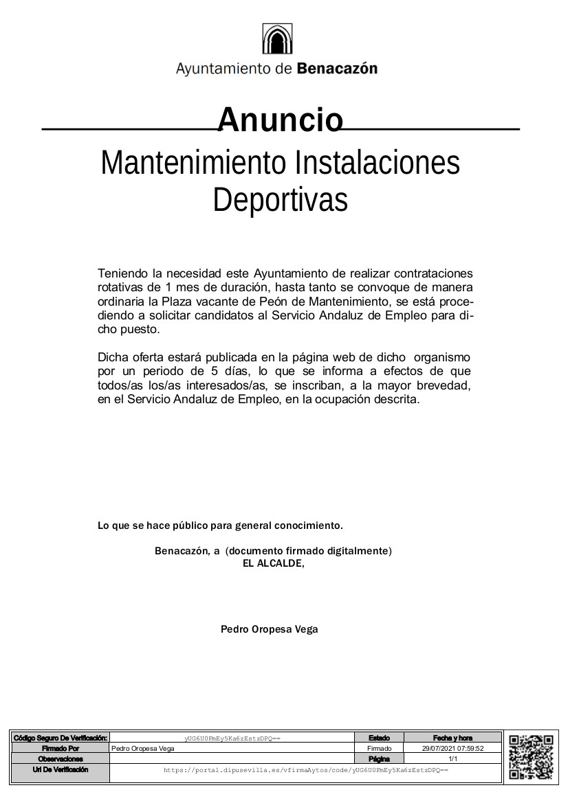 El Ayuntamiento de Benacazón informa que, teniendo la necesidad de realizar contrataciones rotativas de 1 mes de duración, hasta que se convoque de manera ordinaria la Plaza Vacante de Peón de Mantenimiento, se está procediendo a solicitar candidatos al Servicio Andaluz de Empleo para cubrir dicho puesto.