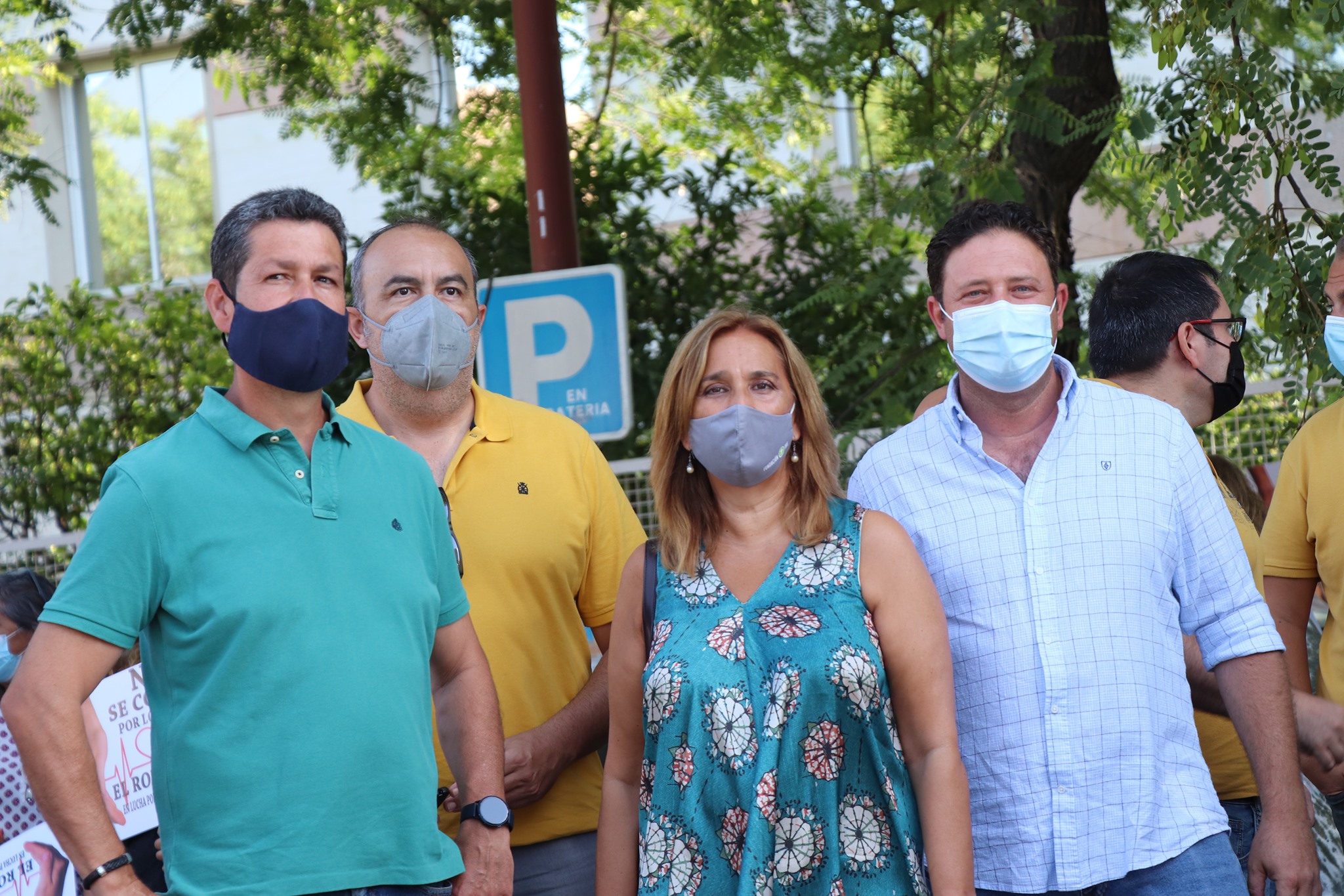 La alcaldesa de Cantillana, Ángeles García, el primer teniente de alcalde, Alonso Javier Mesa, y los delegados municipales de Salud y Servicios Generales, José Manuel García y José Manuel López, han participado en la concentración de protesta llevada a cabo a las puertas de la Consejería de Salud y Familias de la Junta de Andalucía.