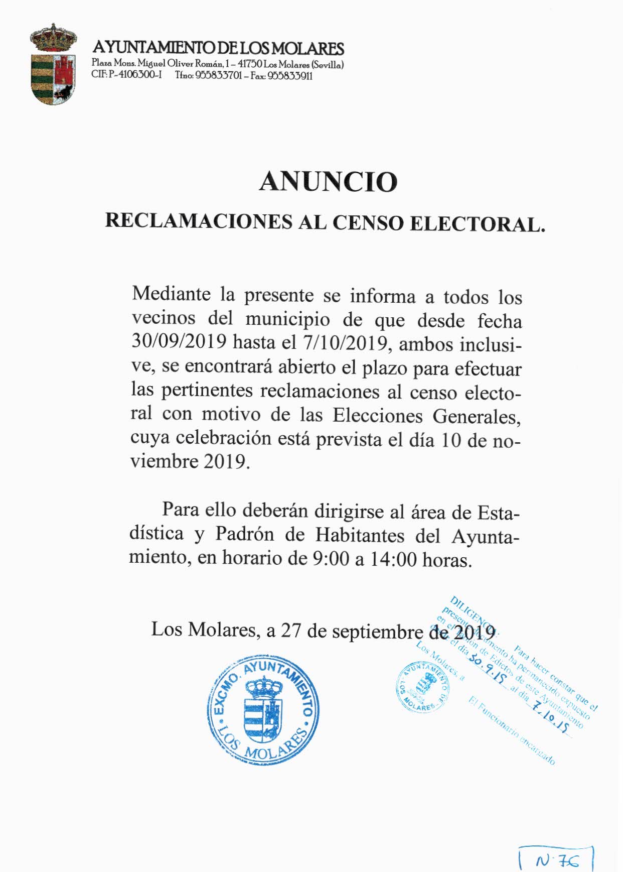 Imagen Ubicación Categoría noticia Participación Ciudadana Mostrar en el carrusel de la sección No Fecha Lun, 30/09/2019 - 11:43 Más información http://www.losmolares.es/es/actualidad/noticias/RECLAMACIONES-AL-CENSO-ELECTORA…